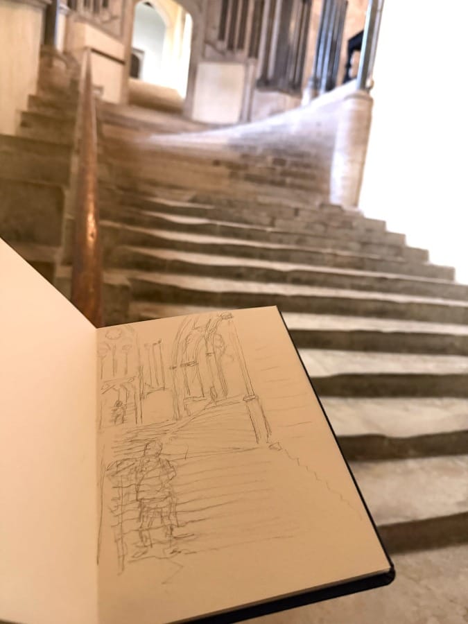 And so here I am in January - the darkest of months - back in a place nudging me toward clarity. On the page, with ink and paint, I find myself in a flow state: curvilinear marks recording not the material facts before me, but the long, slow, incremental pattern of human movement - worn into stone and set against deliberate, joyful, handmade geometry - the incidental and the intentional - connected in ways we can scarcely comprehend.