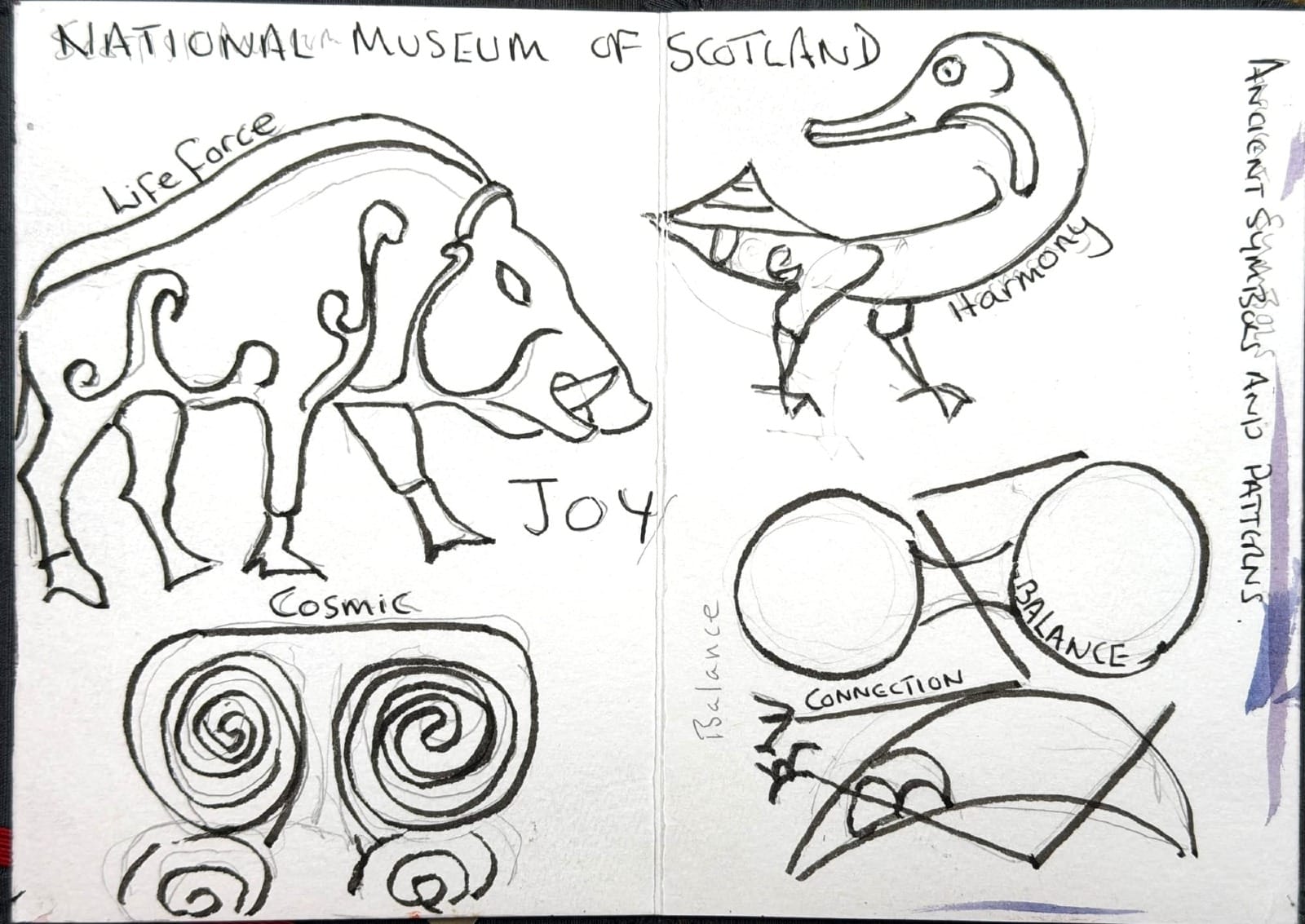 Whilst in Edinburgh in December, I visited the Scottish National Museum and was caught up in a world of Pictish pattern that seems to echo throughout these Isles and throughout time. When I traced their forms onto paper - they lit me up inside and I wrote next to each depiction what it conveyed to me:
