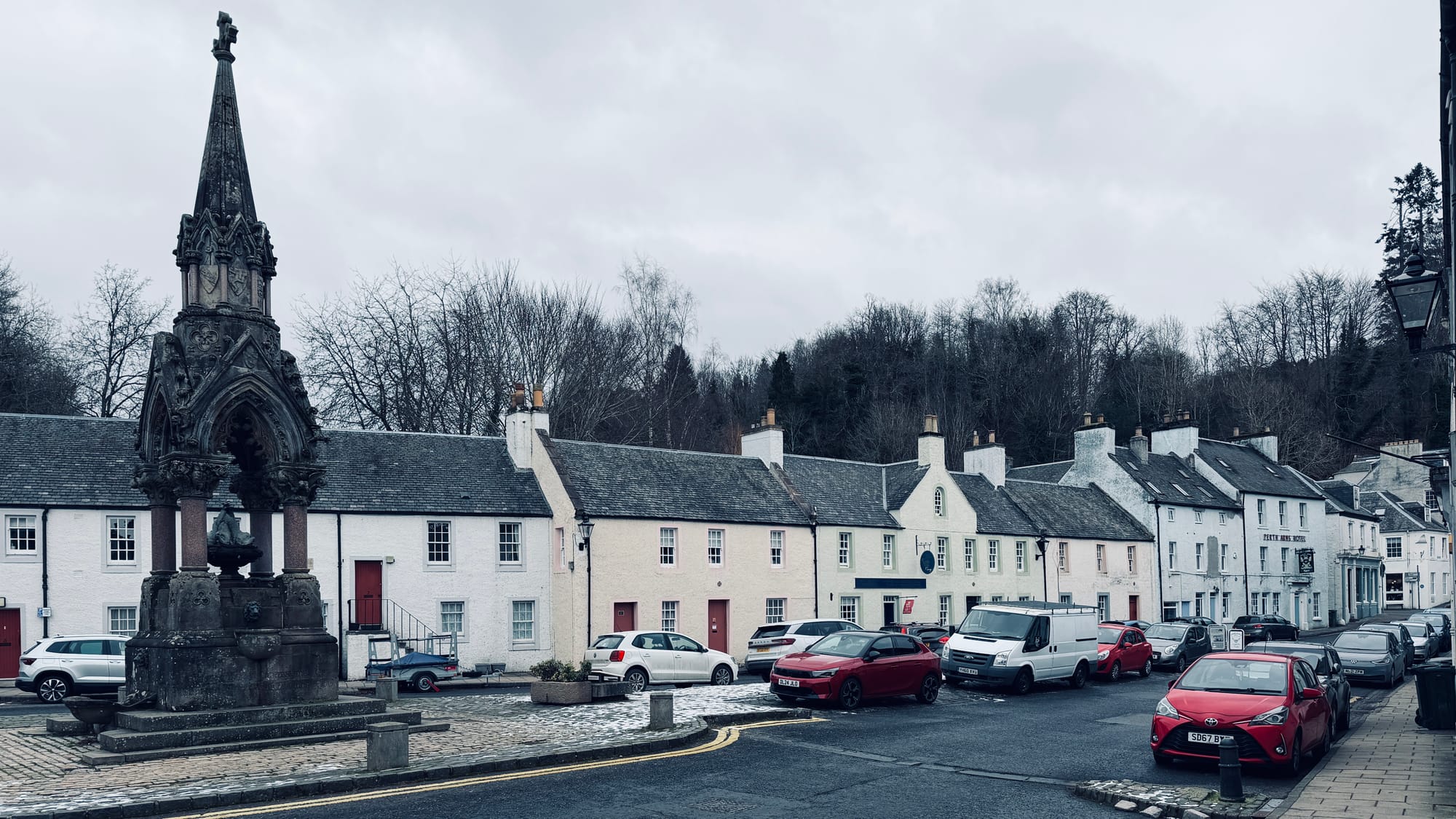 At Dunkeld, where Saint Columba’s relics made the town a spiritual centre of medieval Scotland, the effect deepened further. Intermittent snow flurries drifted through a deadpan sky, and the whole place became an optical chamber - silvered, suspended, acoustically softened too, as though the atmosphere had thickened enough to absorb sound. The light seemed not merely to reveal the town, but to hold it in solution.