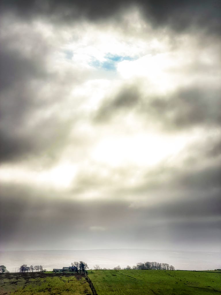 Further south, along the exposed ridges of Hadrian’s Wall, breaks in the cloud altered the register again. Diffusion remained, but now a pearl light emerged - a finer, more angular brilliance that caught the outlines of farm buildings and dry stone walls and made them shimmer in ways difficult to hold in language.