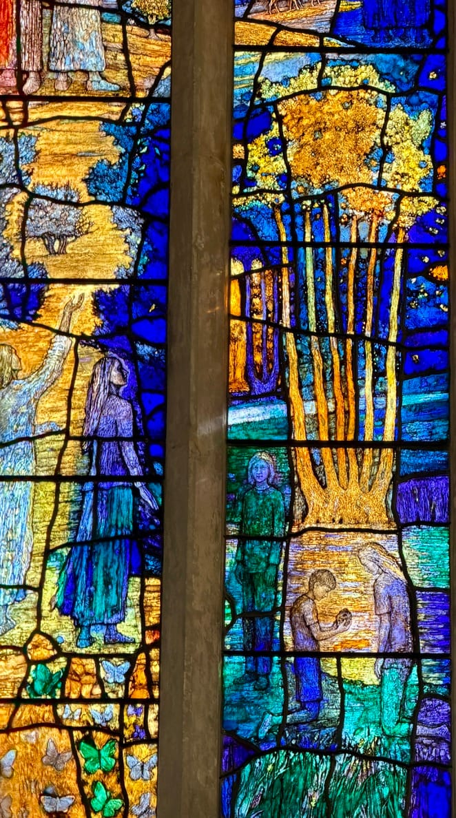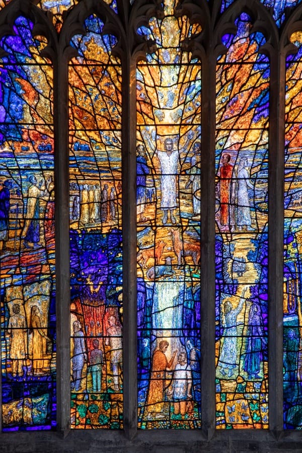 The window seems complex at first, so I squint and find a way into its meaning through its hue and contrast. I can see vibrant and uplifting swatches of complementary colours. The colour, combined with the deliberate and dynamic arc of the lead cames, takes me to the detail, and it’s from there that the narrative begins to form.