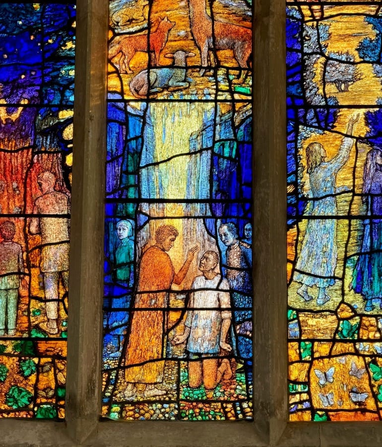 Within the glass there are people who observe Christ transfigured, while others look away into the landscape - into nature - at the wonder of an aged yew tree, birds in flight, translucent moths and vibrant, textured surfaces.