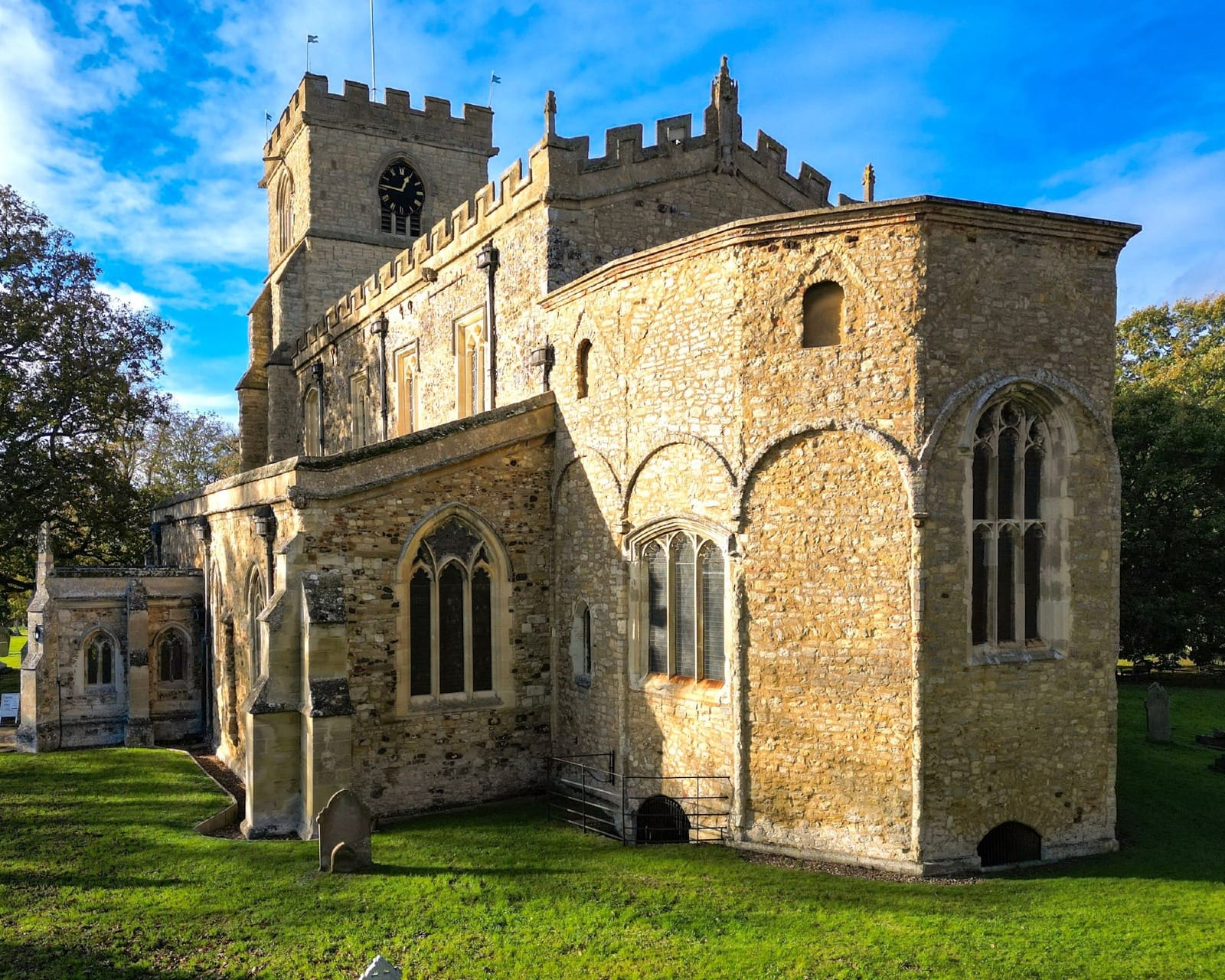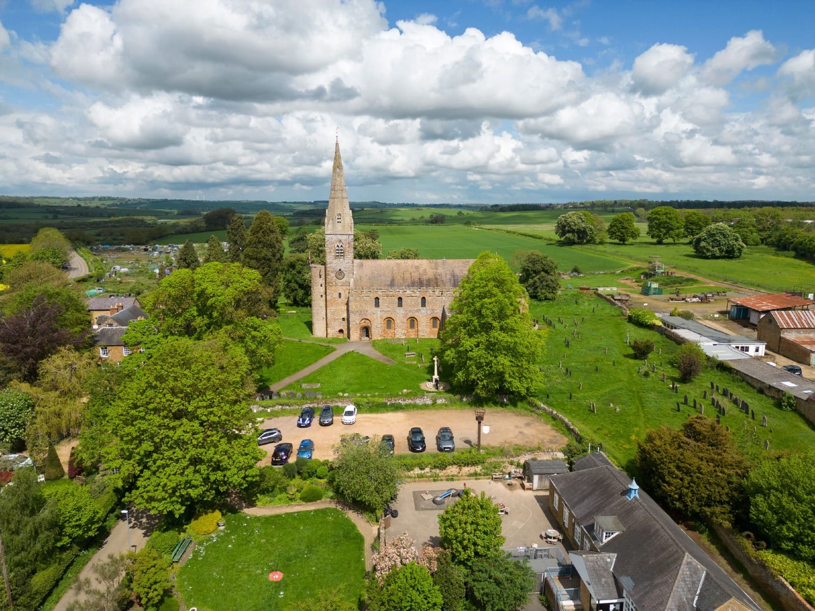 St. Andrew at Brigstock is renowned for its late C10th Saxon tower and circular stair turret. The spire is a later addition.