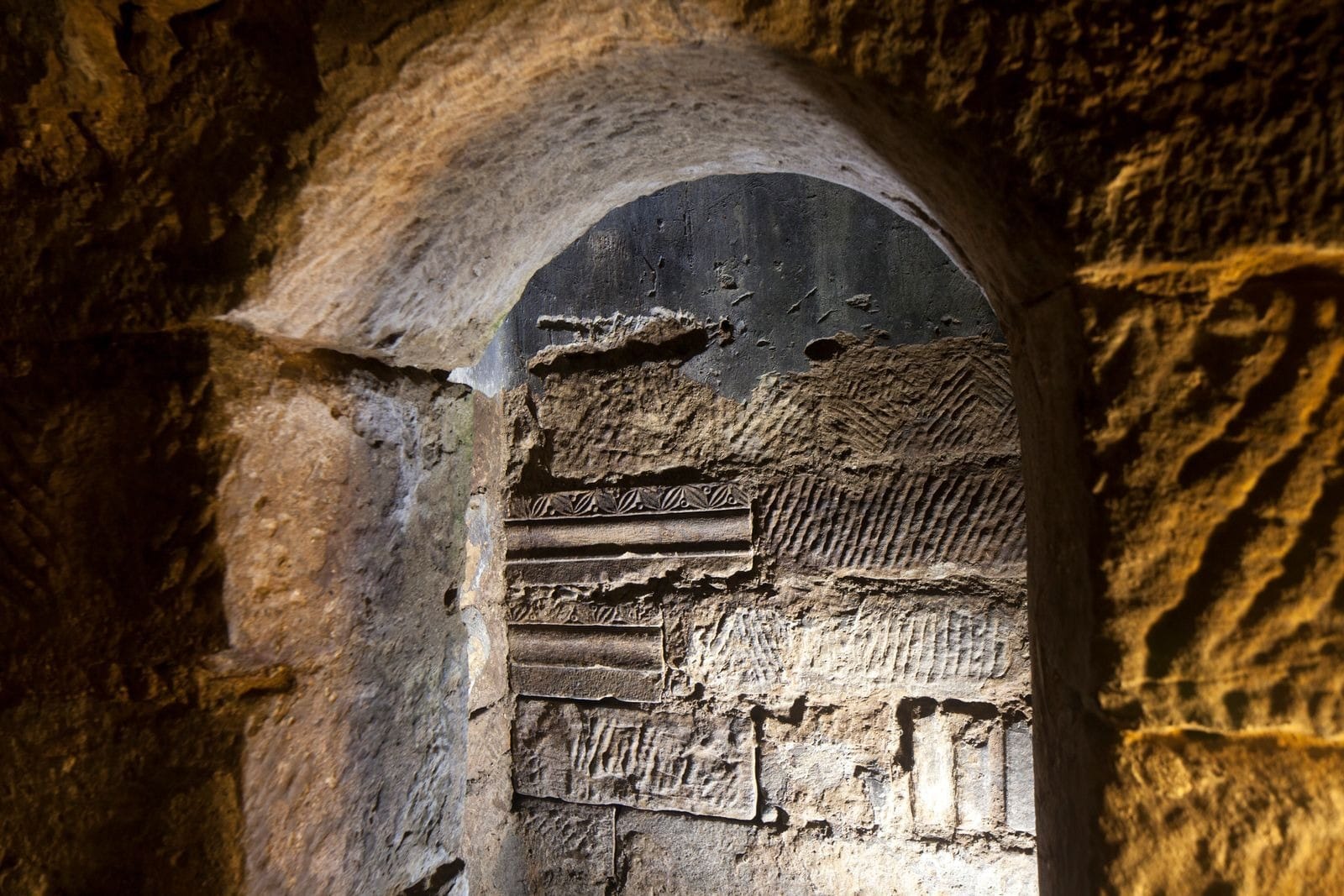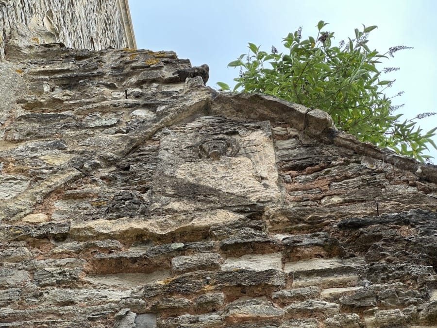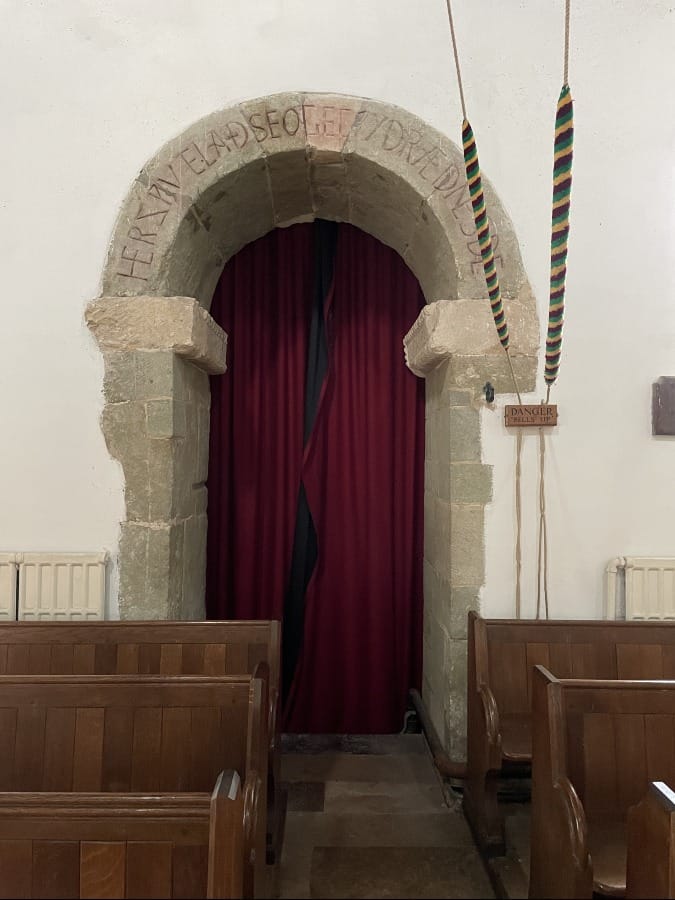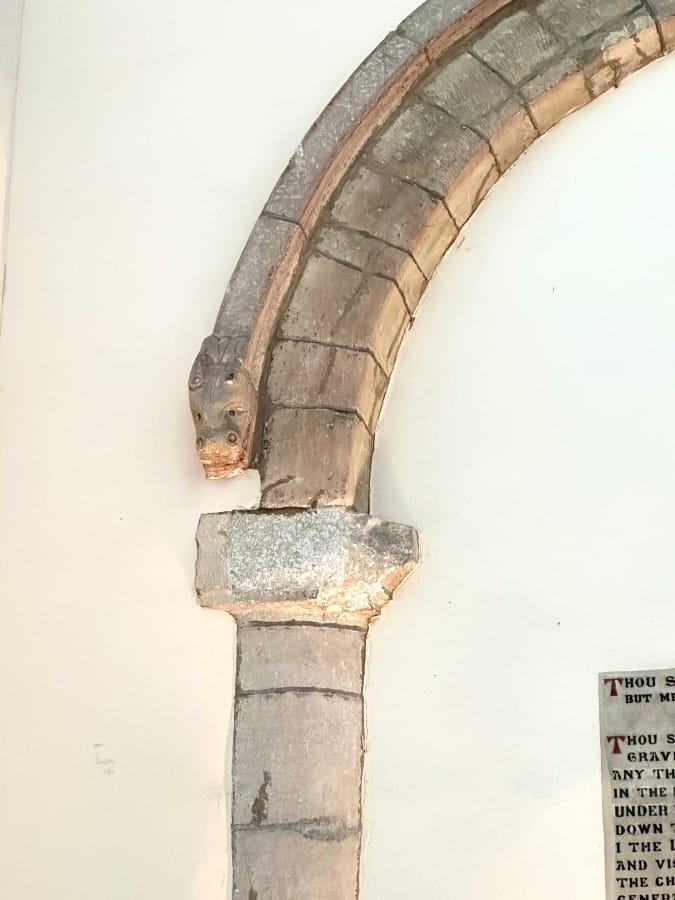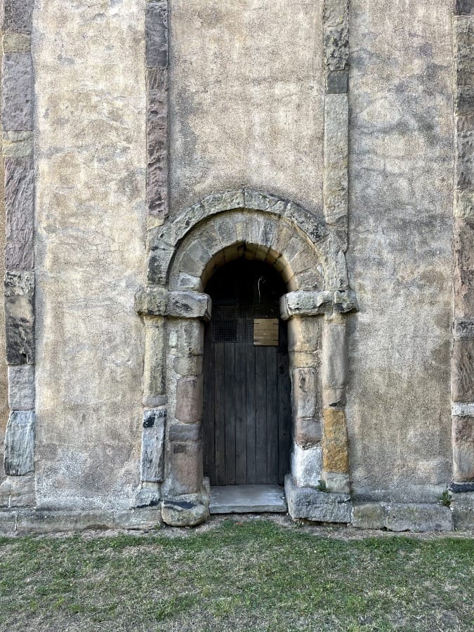 Looking up to the Anglo-Saxon door arch.