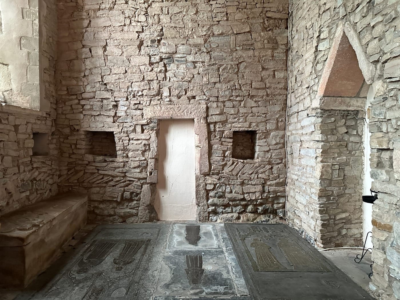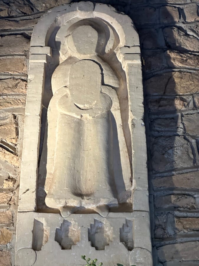 Inside, we are greeted by an C8th Virgin with Child that might have been part of the destroyed apse (alongside the angel). Some painting still survives on the stone.