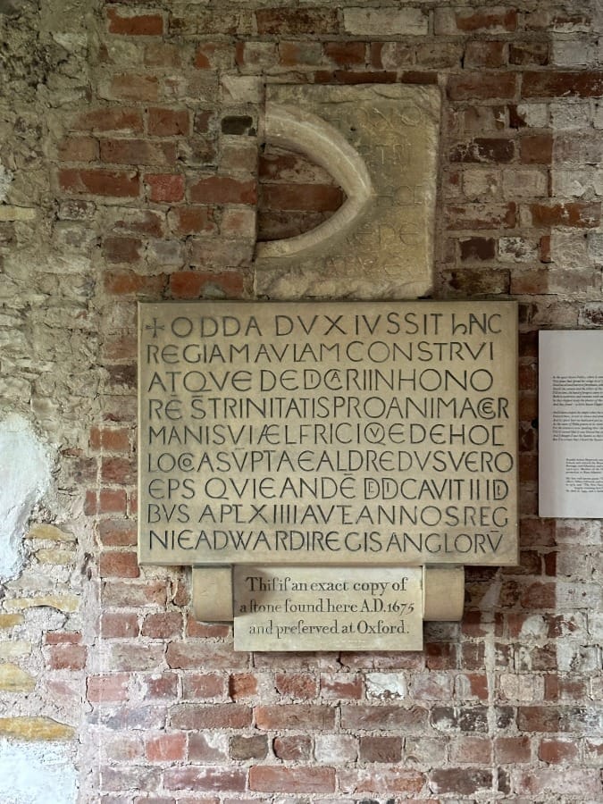 'Earl Odda ordered this royal chapel to be built and dedicated in honour of the Holy Trinity for the good of the soul of his brother Aelfric who died in this place. Bishop Ealdred dedicated it on April 12th in the 14th year of the reign of Edward, King of the English.'