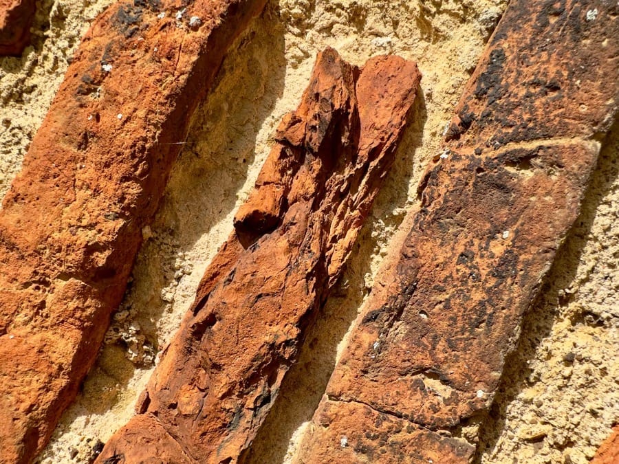 Parts of the brick tiles are still burnt from their firing and parts still hold the grit that got caught up in their making. Some have the lines of the drying rack still on them.