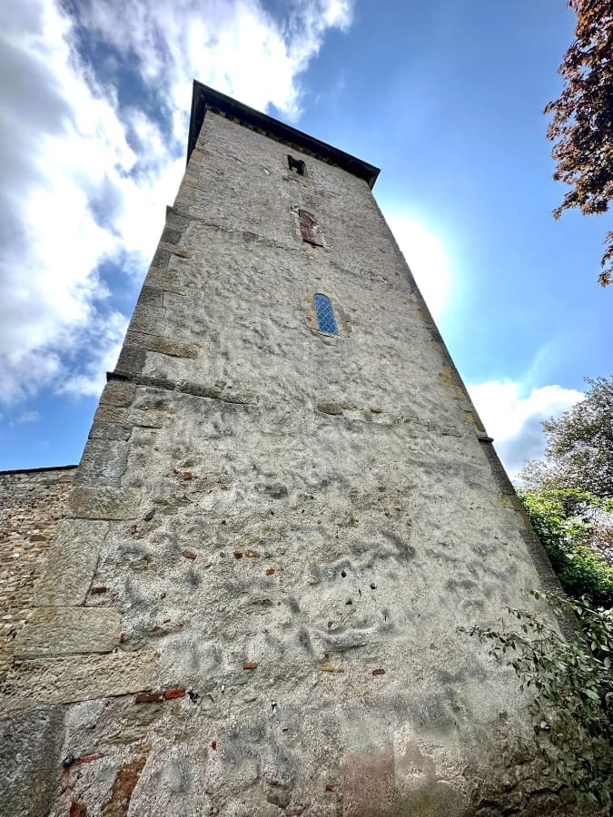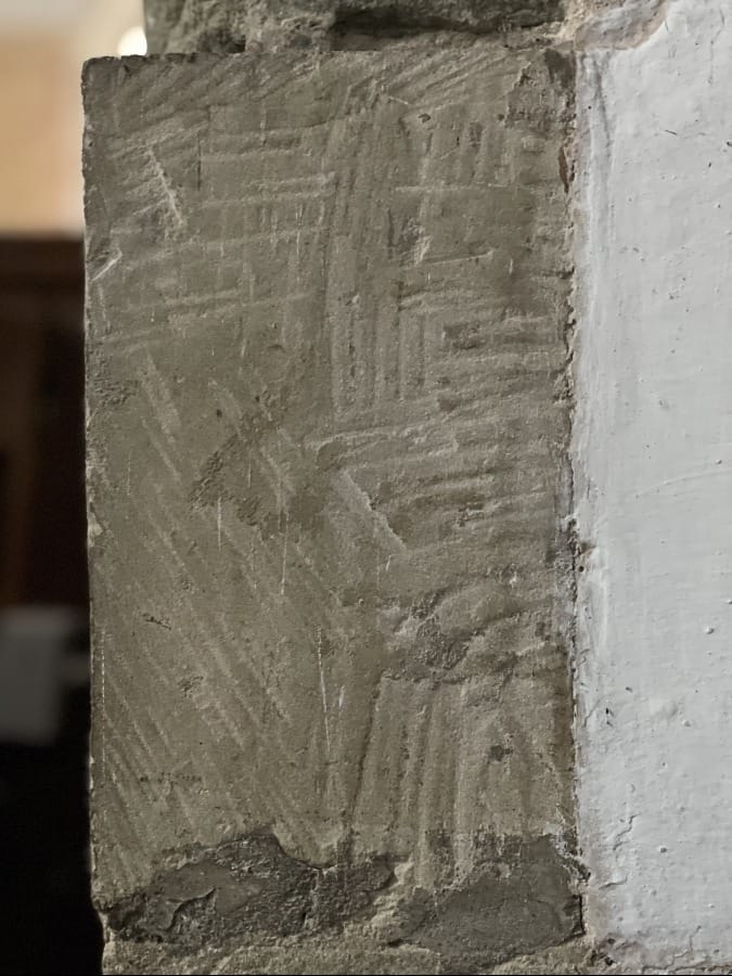 There are Roman brick tiles embedded in the wall, they are around 1700 years old. They still have the patterns and swirls of hand-slapped clay (tugged up from the earth around Leicester and Towcester they say).