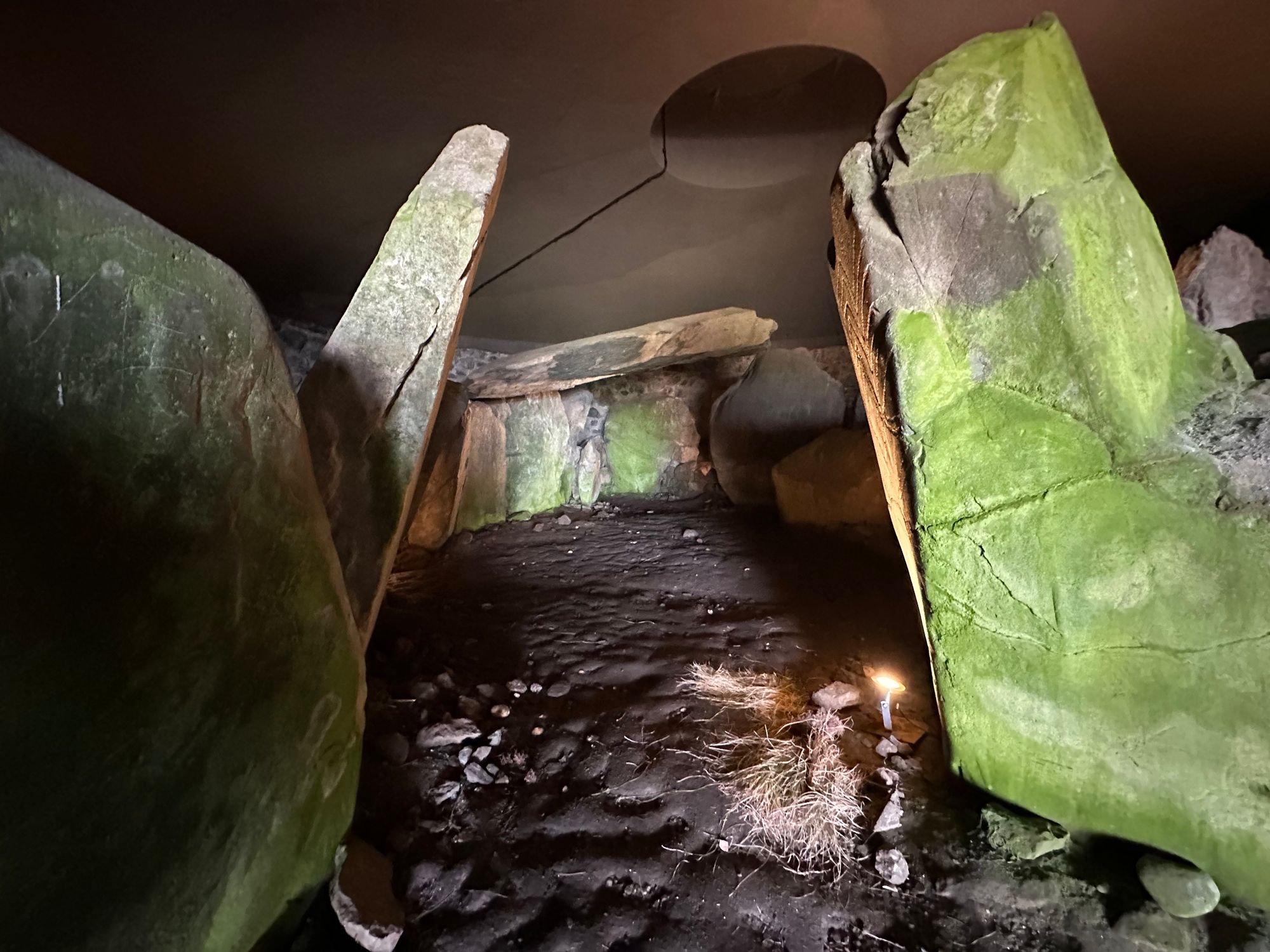 On the ancient stones are zig-zag patterns and spirals that correspond with Neolithic sites in Ireland.