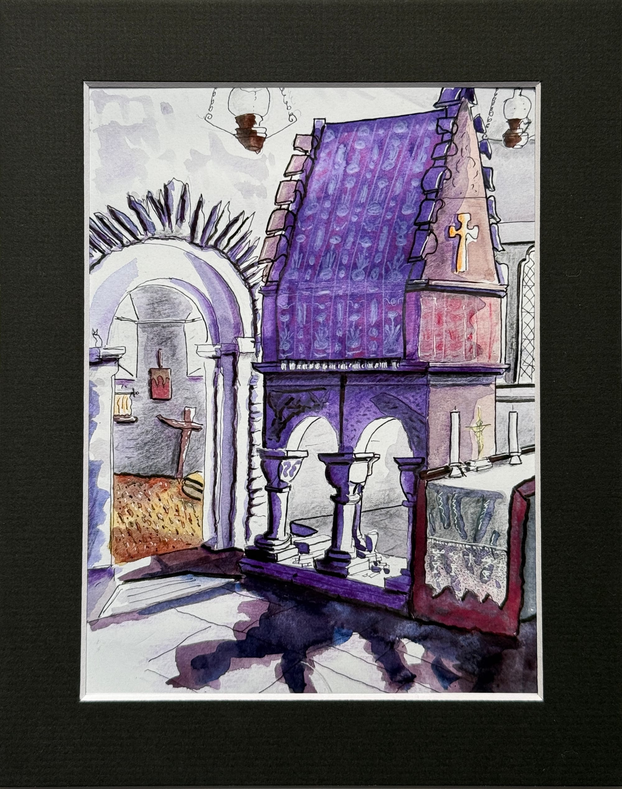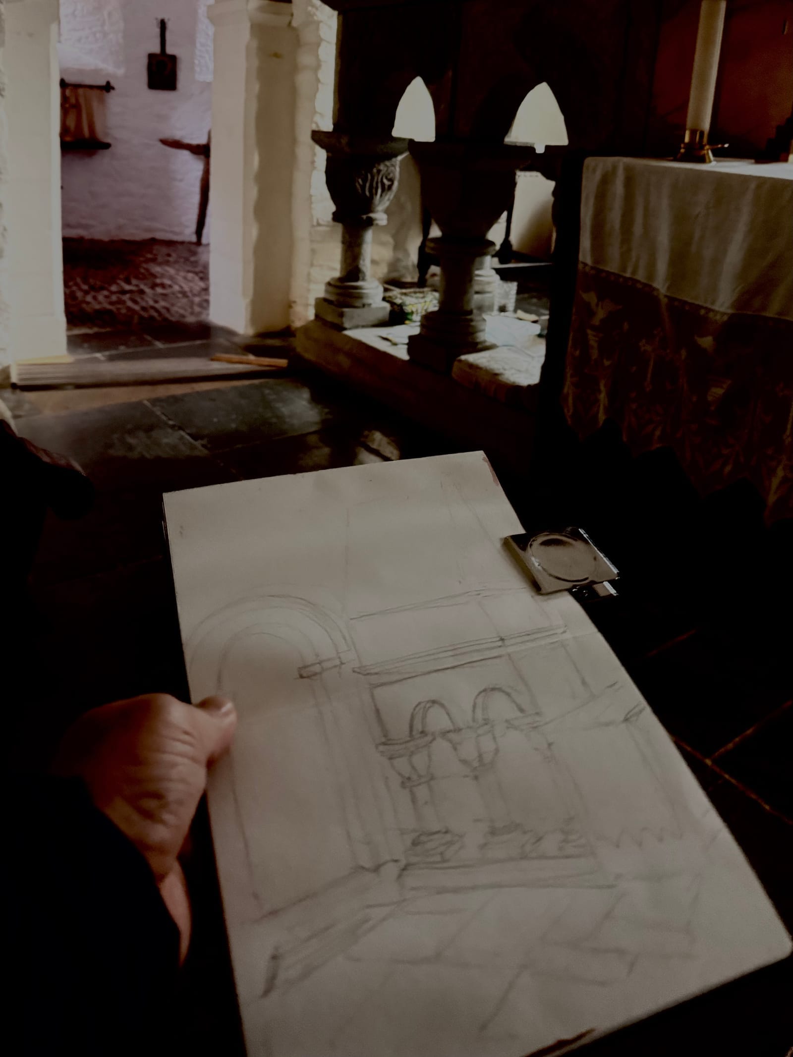 This is a sketch from my watercolour sketchbook. A very special place with a rare surviving Romanesque shrine dedicated to St. Melangell, patron saint of hares.