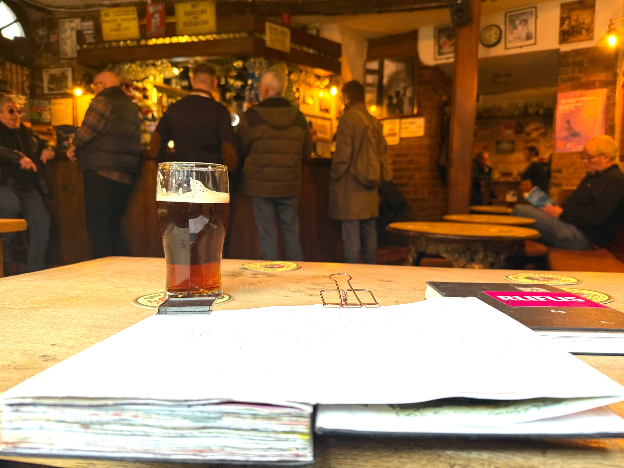 And so, of course, I want to capture Gibbonsβ rump of a house, to sketch its weathered form, its organic decay. I trace the lines in my mind, but the cold creeps into my fingers before I can set pen to paper. I retreat into the snug warmth of the pub, order a pint, and turn my attention to the space around me.
