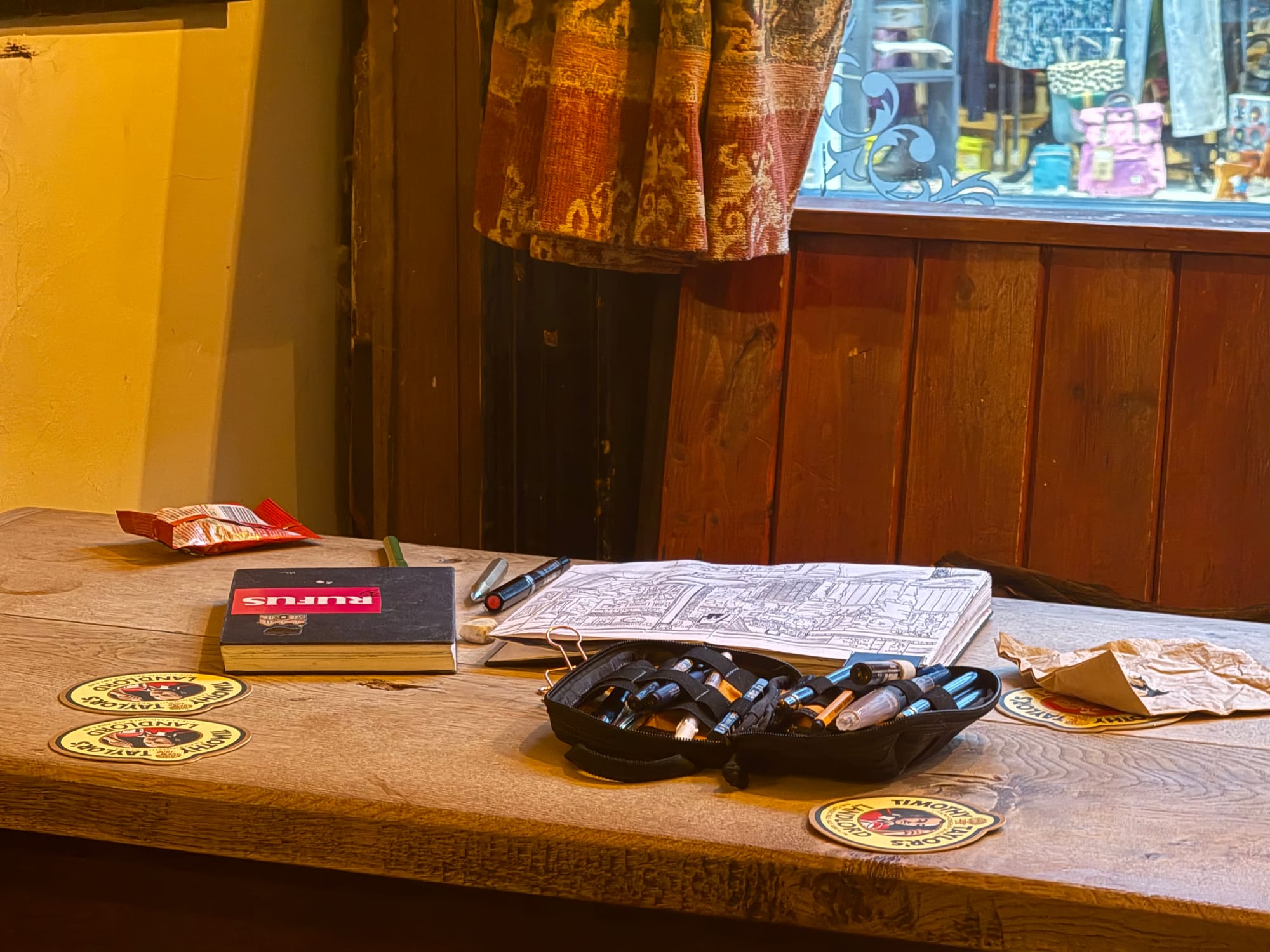 As I sketch, the people of this town come and go β their conversations rise and fall. The bar staff change shifts; time dissolves, and outside, the timber framing stands unmoved.