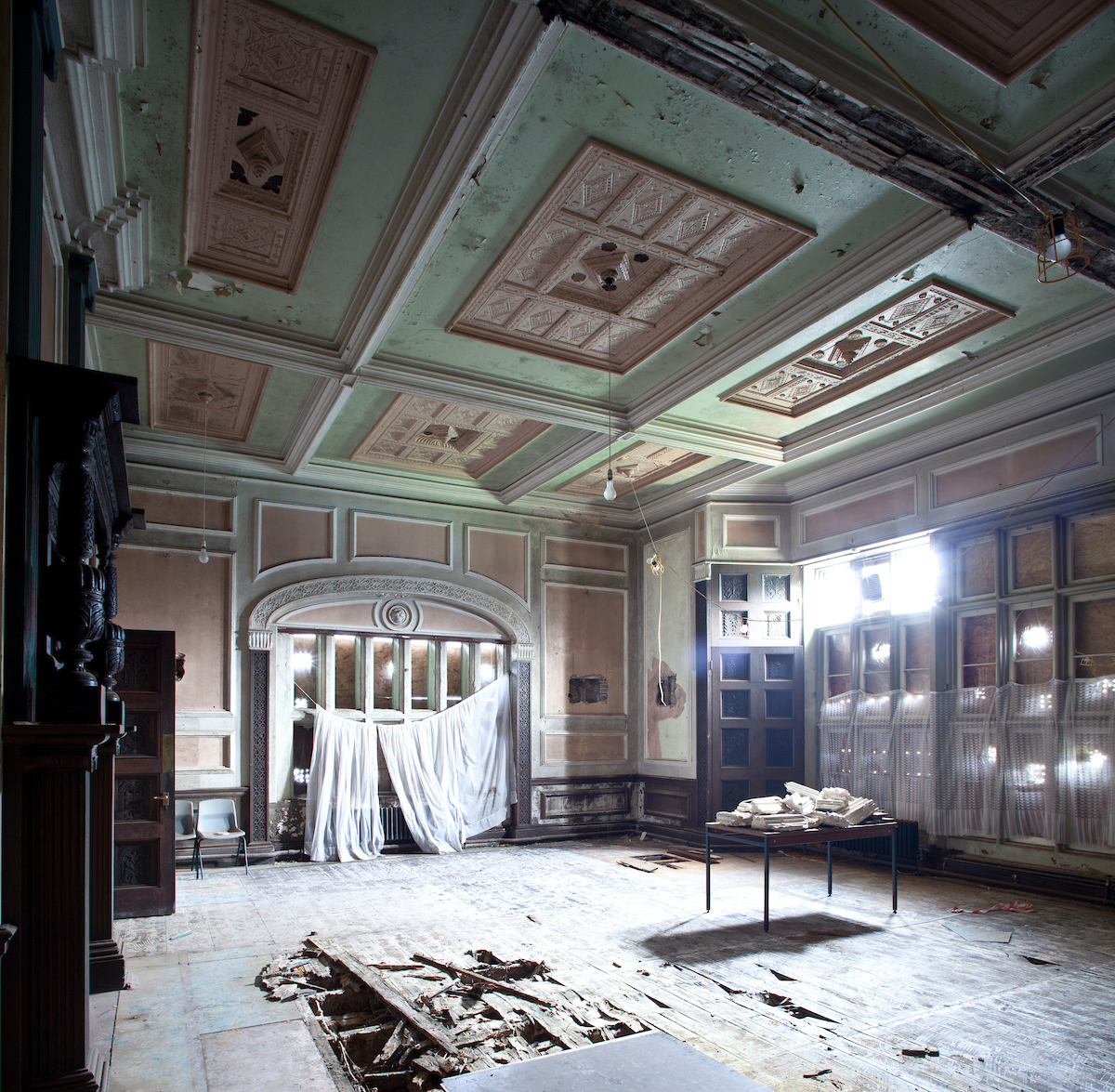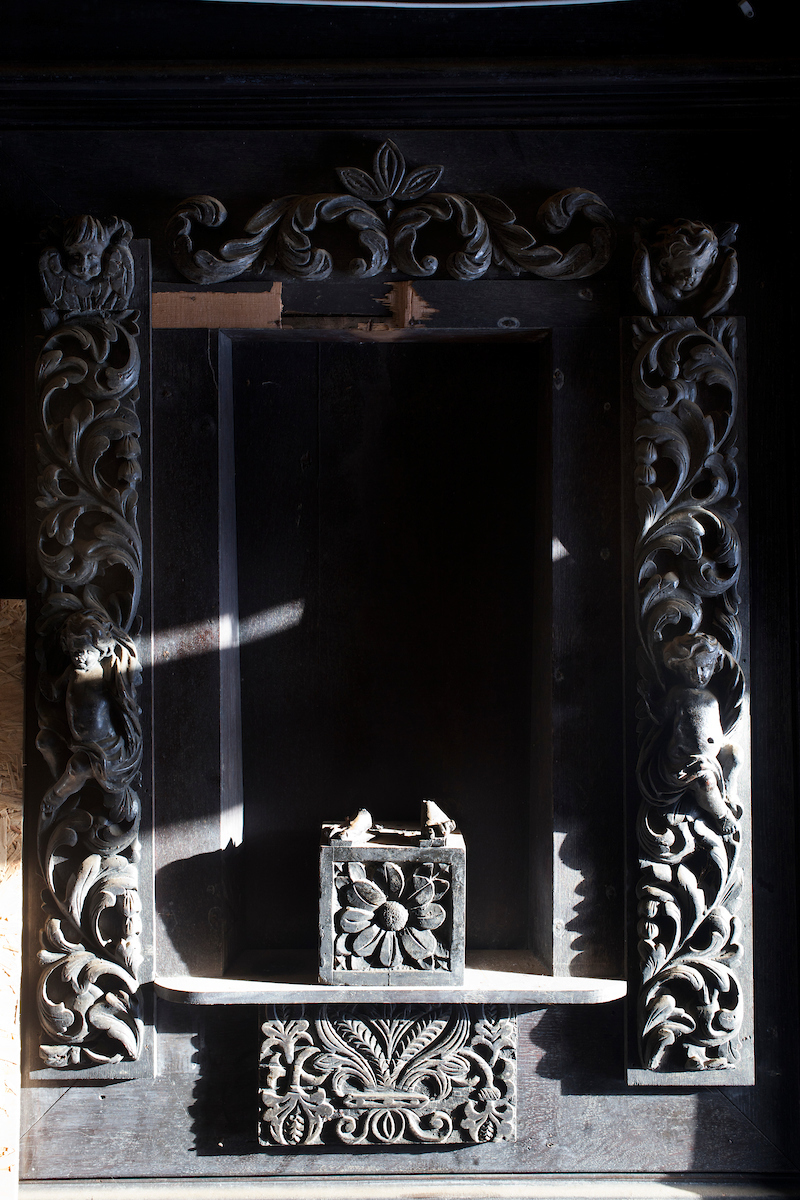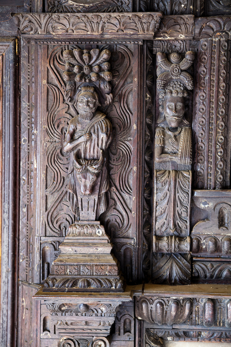 The scene that emerged before me in the Oak Room was of dereliction and decay. I could hear a dripping sound somewhere in the distance. Somebody had stolen the lead from the central gulley which ran like a spine across the whole building. Because of the halls isolation, water had been pouring in for some time. To make things worse, thieves had forced entry and taken carvings and statues in the panelled rooms. And what carvings they were: oak panels deep cut and floriated in a Northern Renaissance style: faces gurning, gadrooned exotic birds, and effigies arcing out as if from the prow of a ship.