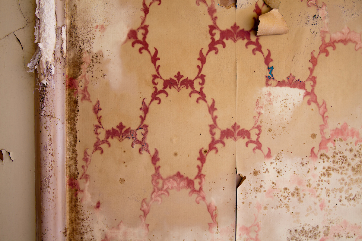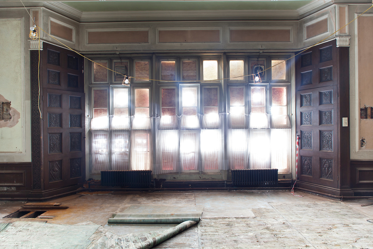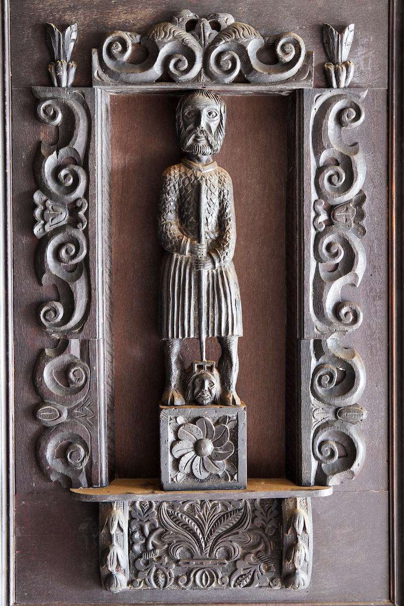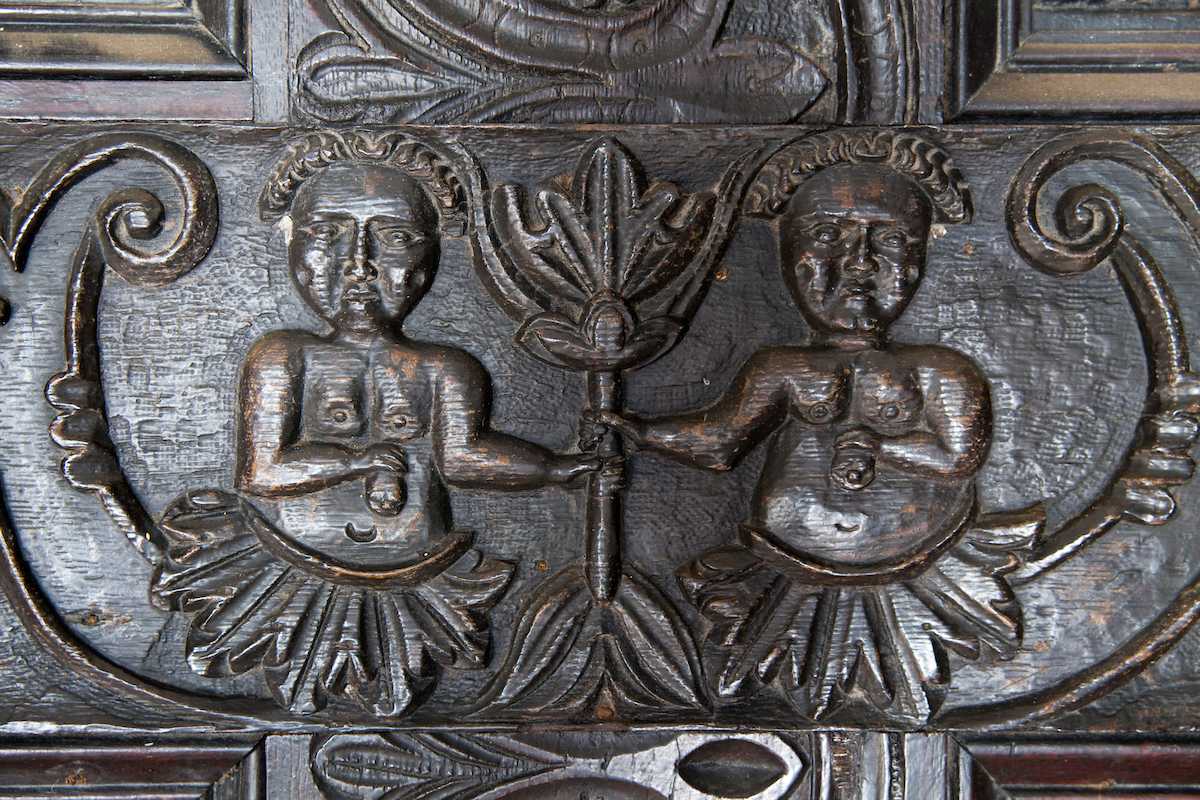 The scene that emerged before me in the Oak Room was of dereliction and decay. I could hear a dripping sound somewhere in the distance. Somebody had stolen the lead from the central gulley which ran like a spine across the whole building. Because of the halls isolation, water had been pouring in for some time. To make things worse, thieves had forced entry and taken carvings and statues in the panelled rooms. And what carvings they were: oak panels deep cut and floriated in a Northern Renaissance style: faces gurning, gadrooned exotic birds, and effigies arcing out as if from the prow of a ship.