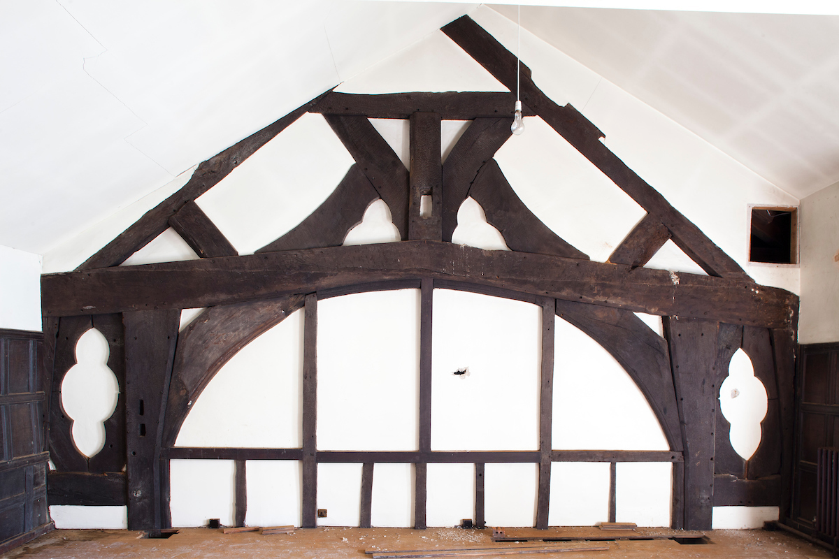 In spite of that, it was to be part of the original open hall, a darkened room, that drew me away from the Oak Parlour. It was a mere rump, a truncated chamber with mullions shuttered by ply and a shattered gas fire protruding along a panelled wall.