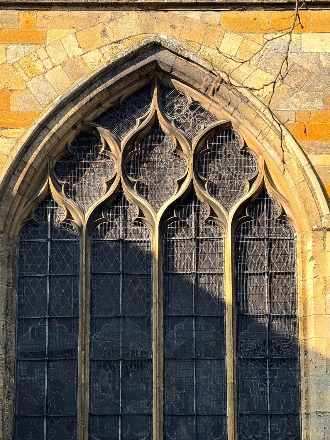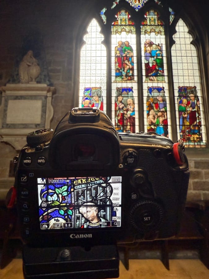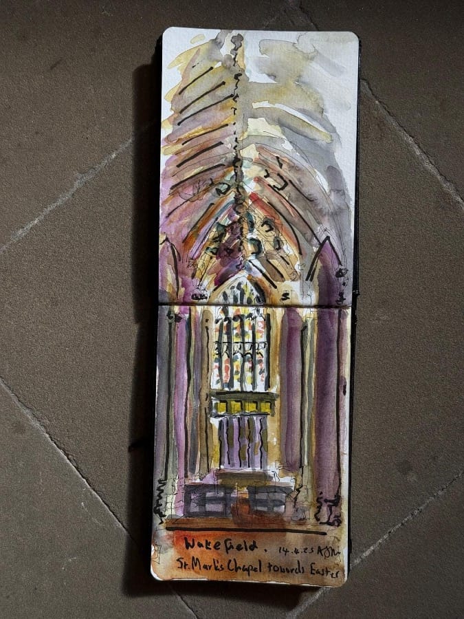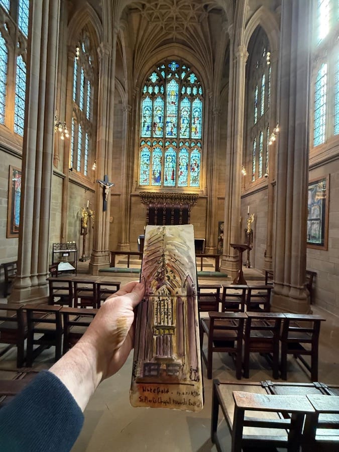 At Wakefield, I had to wait for the light to shift obliquely to the glass, reducing the impact of the exterior grille shadows on the stained glass I was photographing. To fill the time, I sketched the wonderfully atmospheric St Mark’s Chapel. I was in a John Piper kind of mood…
