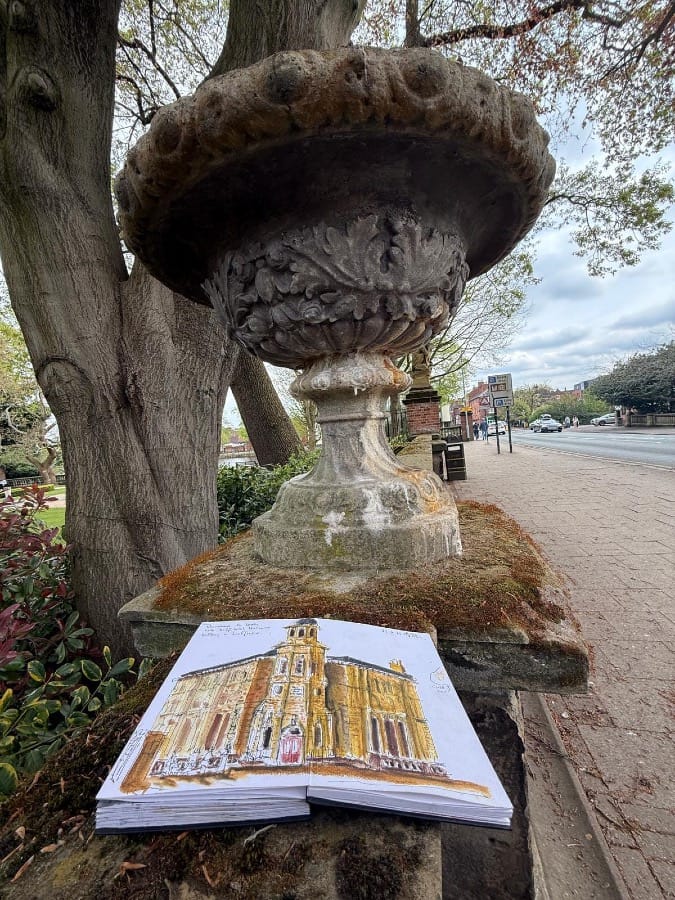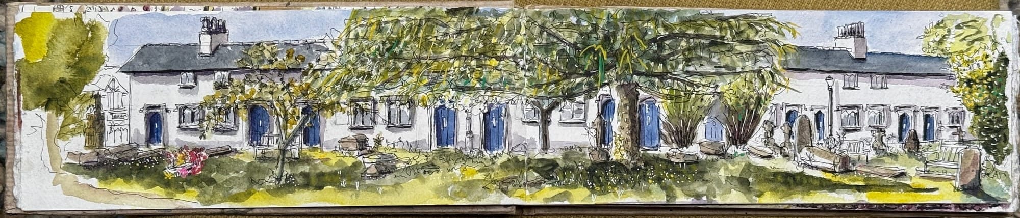 Replenished with a new croissant I sought cover in the church yard where I sat and sketched the almshouses there.