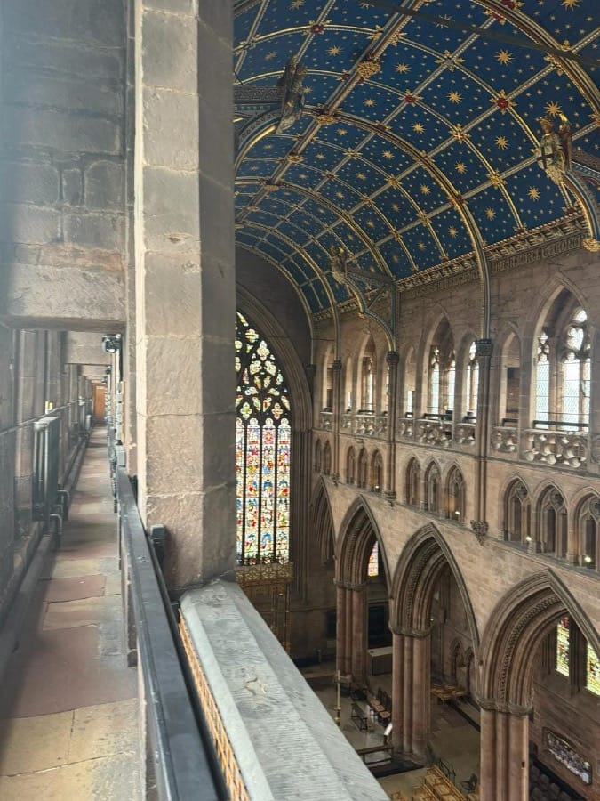 My task at Carlisle was to photograph the window at the east end. To get some close up shots, I was taken up into the clerestory. So lucky to be able to get up into the clerestory to hover next to the east window with the angels.