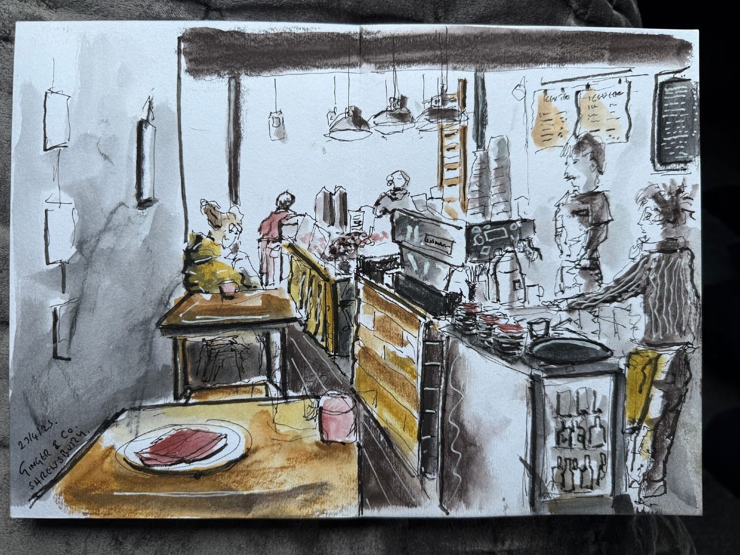 Travelling down to Lichfield Cathedral I took coffee at Ginger & Co in Shrewsbury - limited palette of earth colours for this sketch.