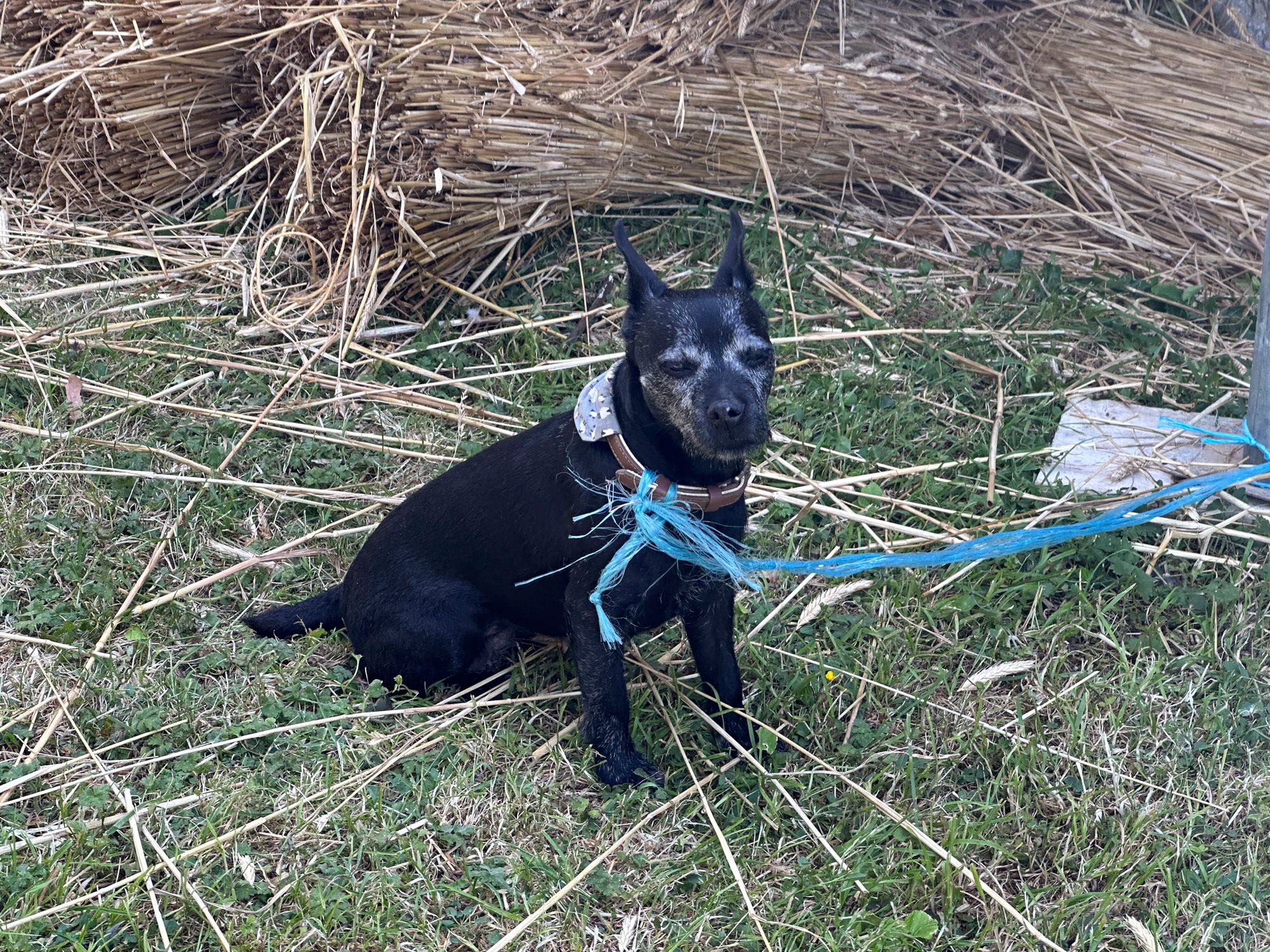 As I work I can hear the bill hook of the thatcher outside. His dog Spike sits below the scaffold waiting for his master to finish.
