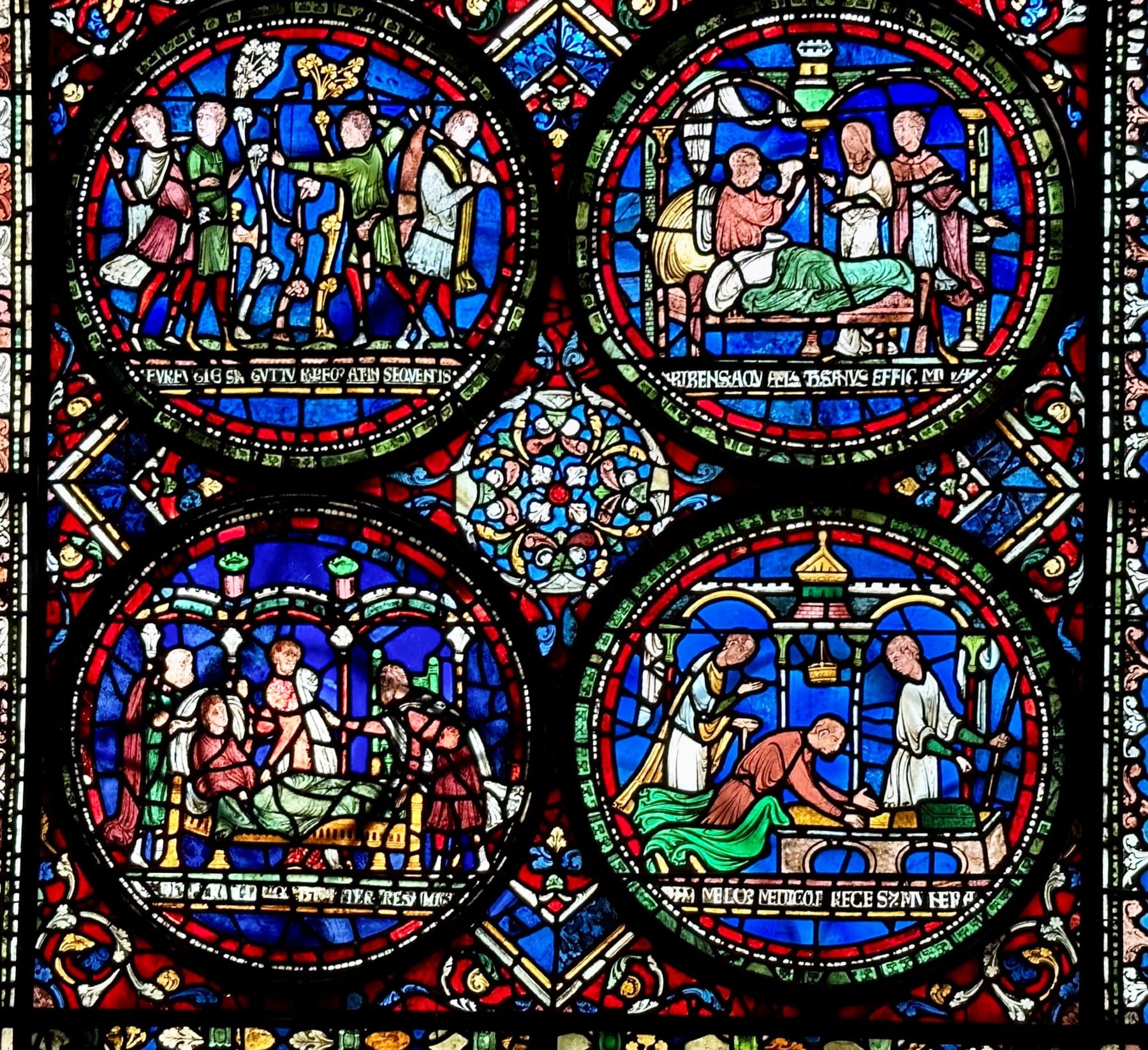 The four roundels below depict one of the miracles. Poachers are pursued by the gamekeeper who is wounded in the neck with an arrow. Mortally wounded, he takes to his bed. Shortly after taking some of the holy waters from Thomas Becket's shrine he is healed. The final roundel shows him at the shrine of Thomas Becket with the holy water well and bucket behind him.