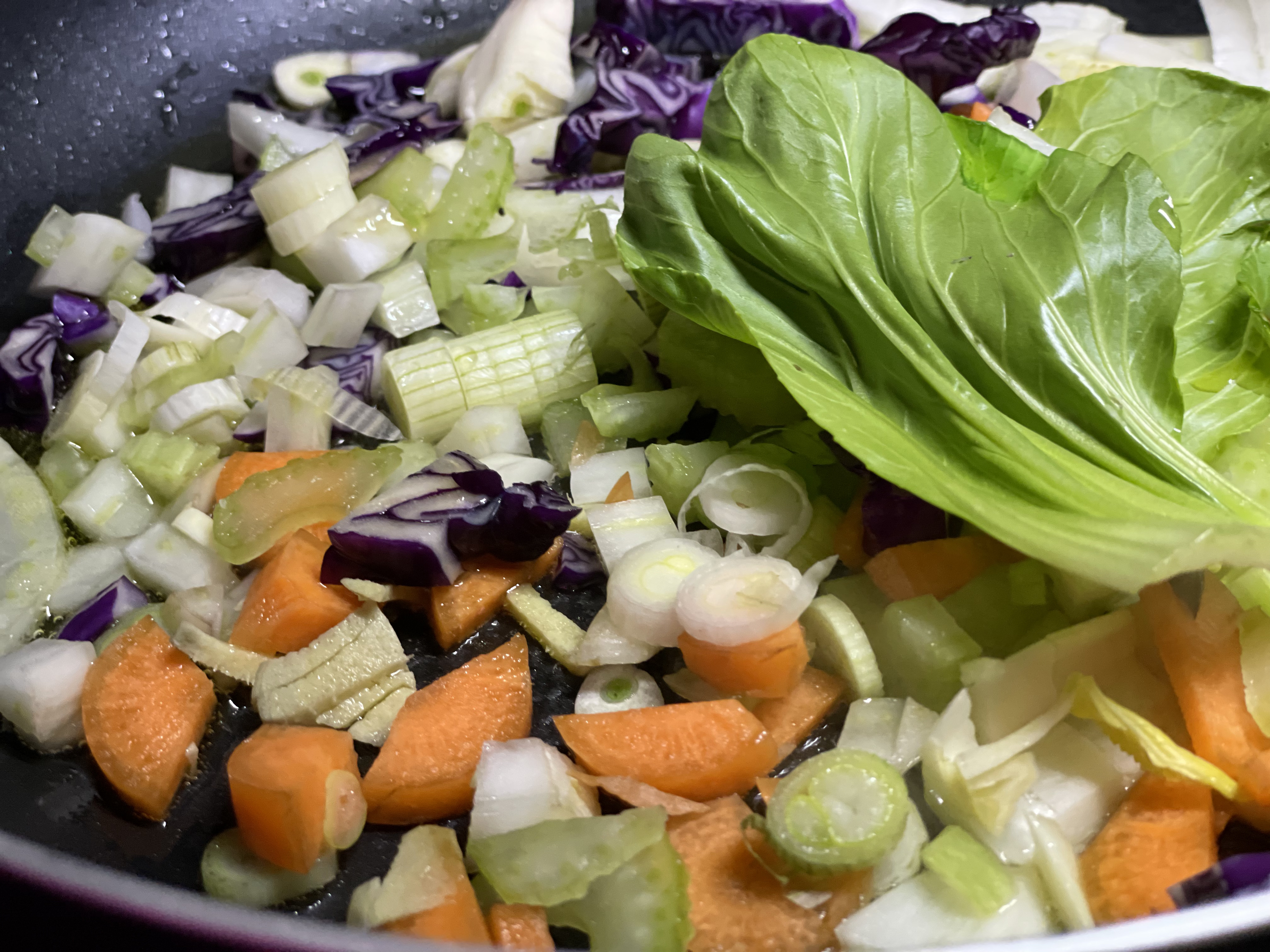 In a flat frying pan gently fry the garlic, ginger, pak choi, carrot, celery and spring onions in sesame oil.