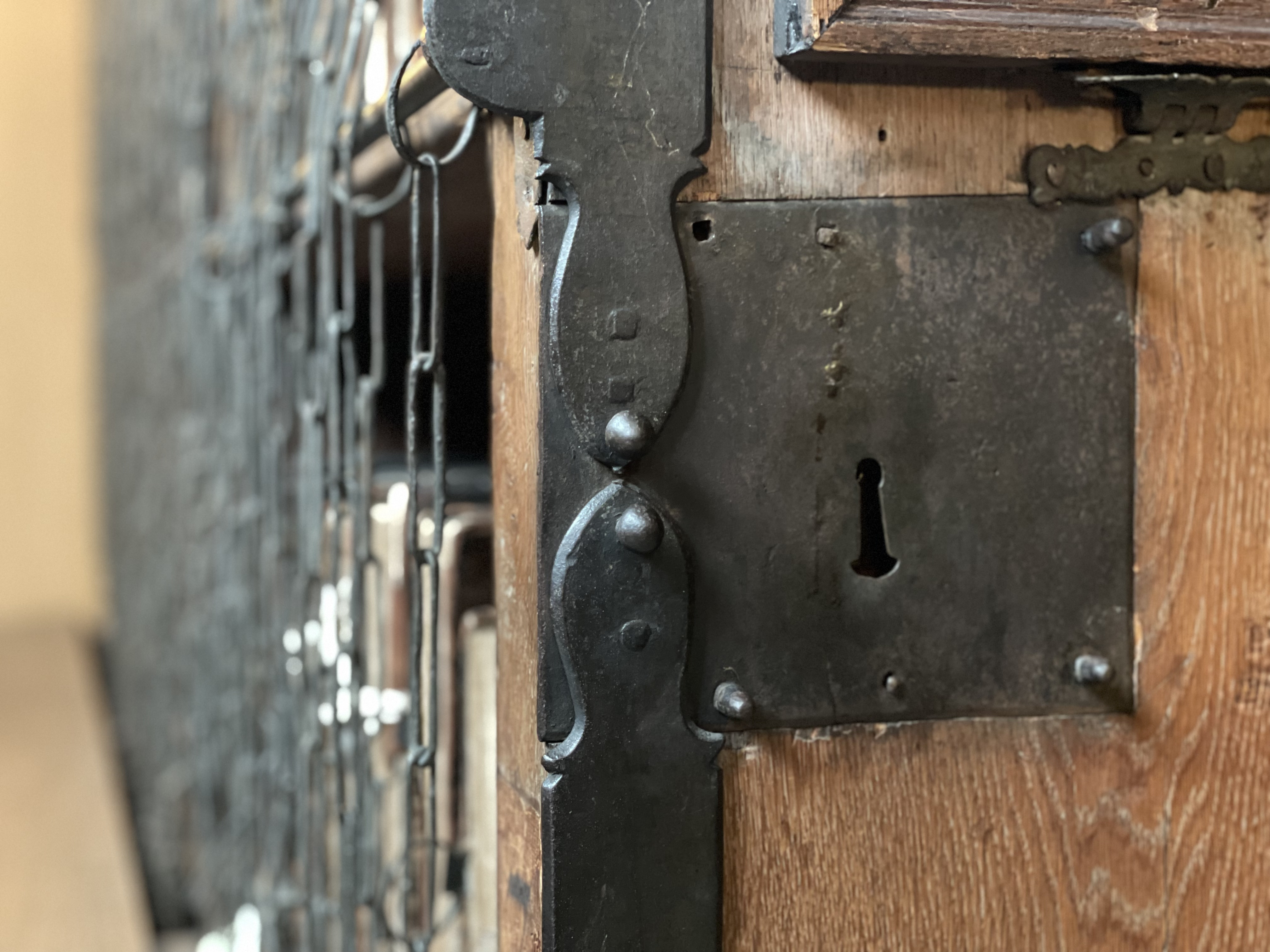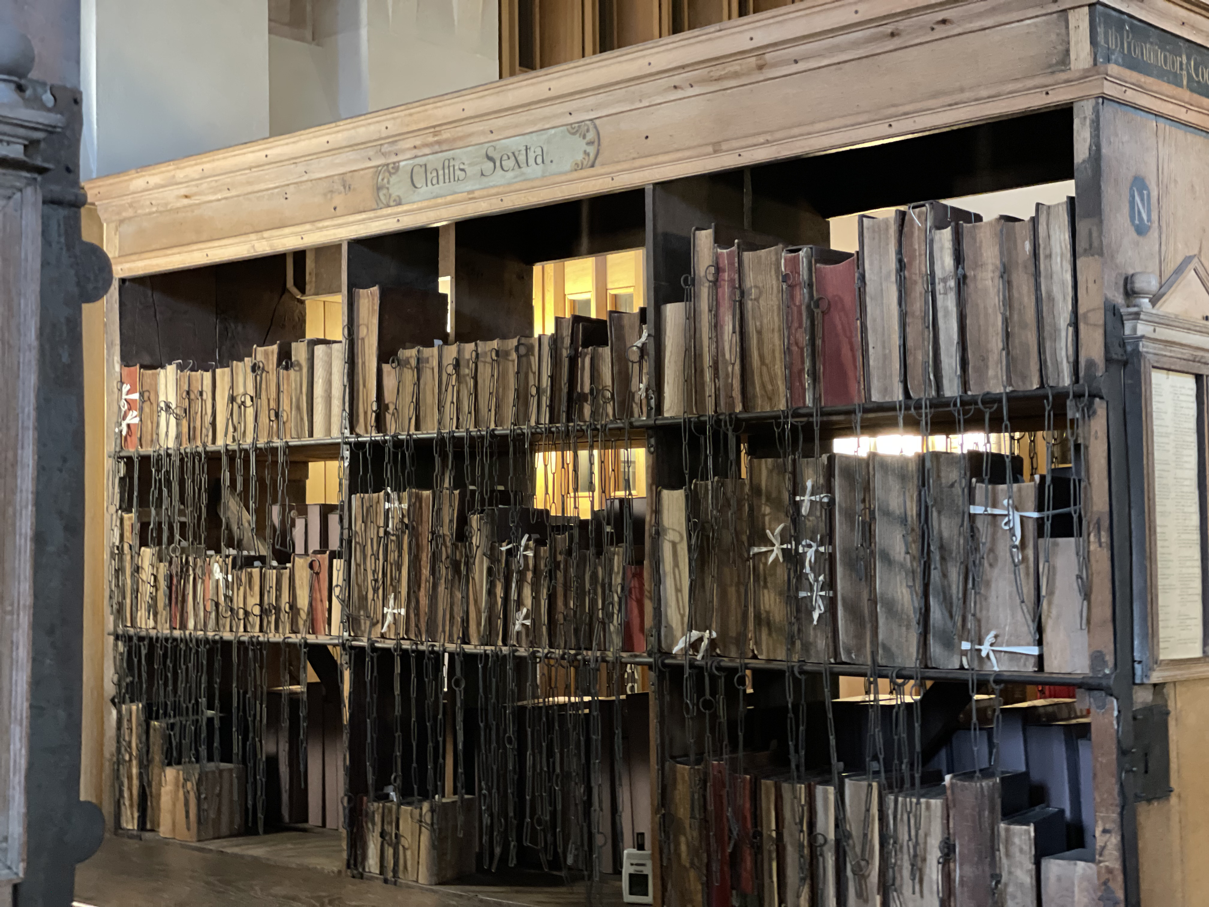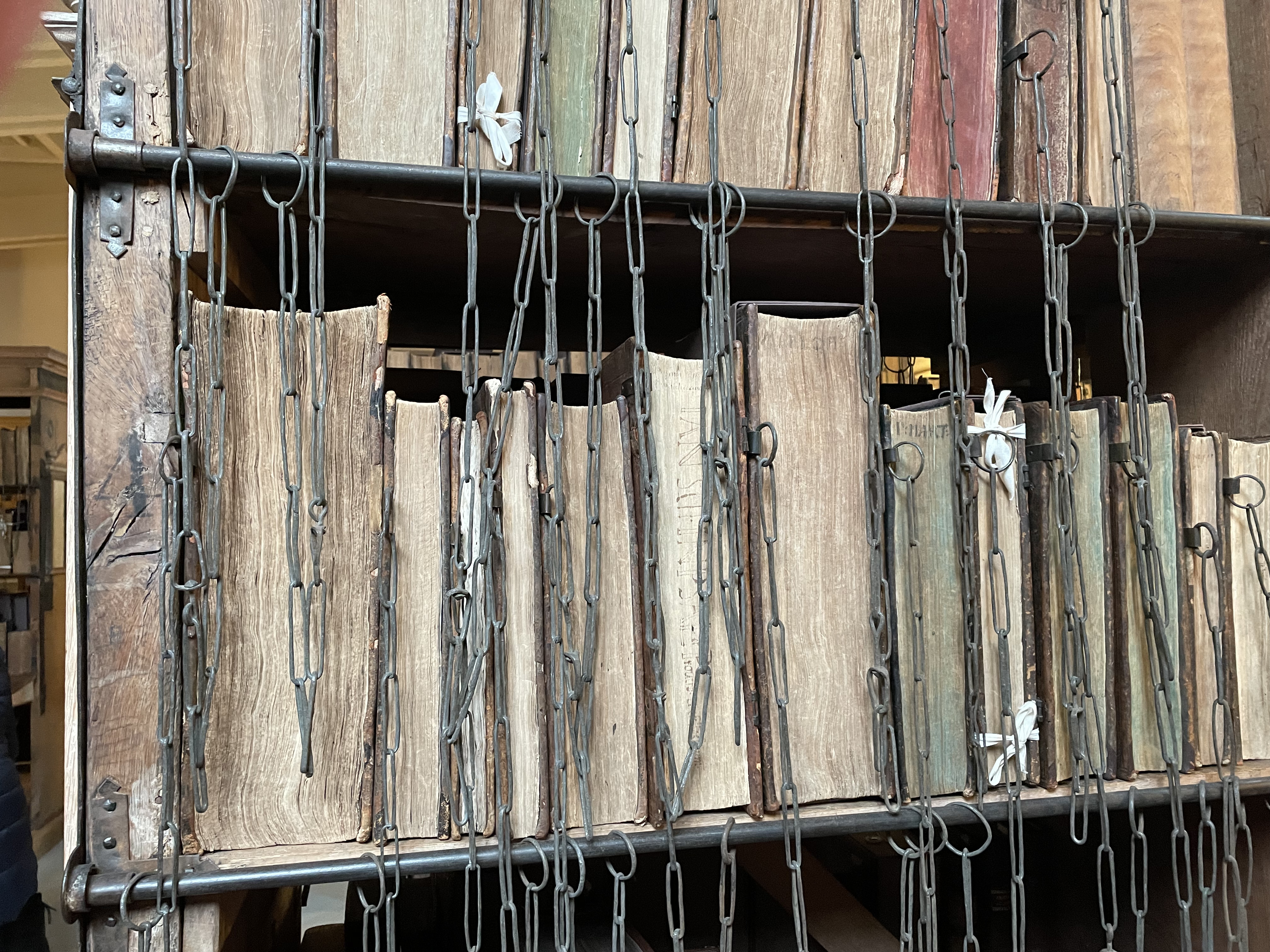 Contains the C8th Hereford Gospels. Each book is chain linked onto an iron rod attached to a lock. There is only one key.