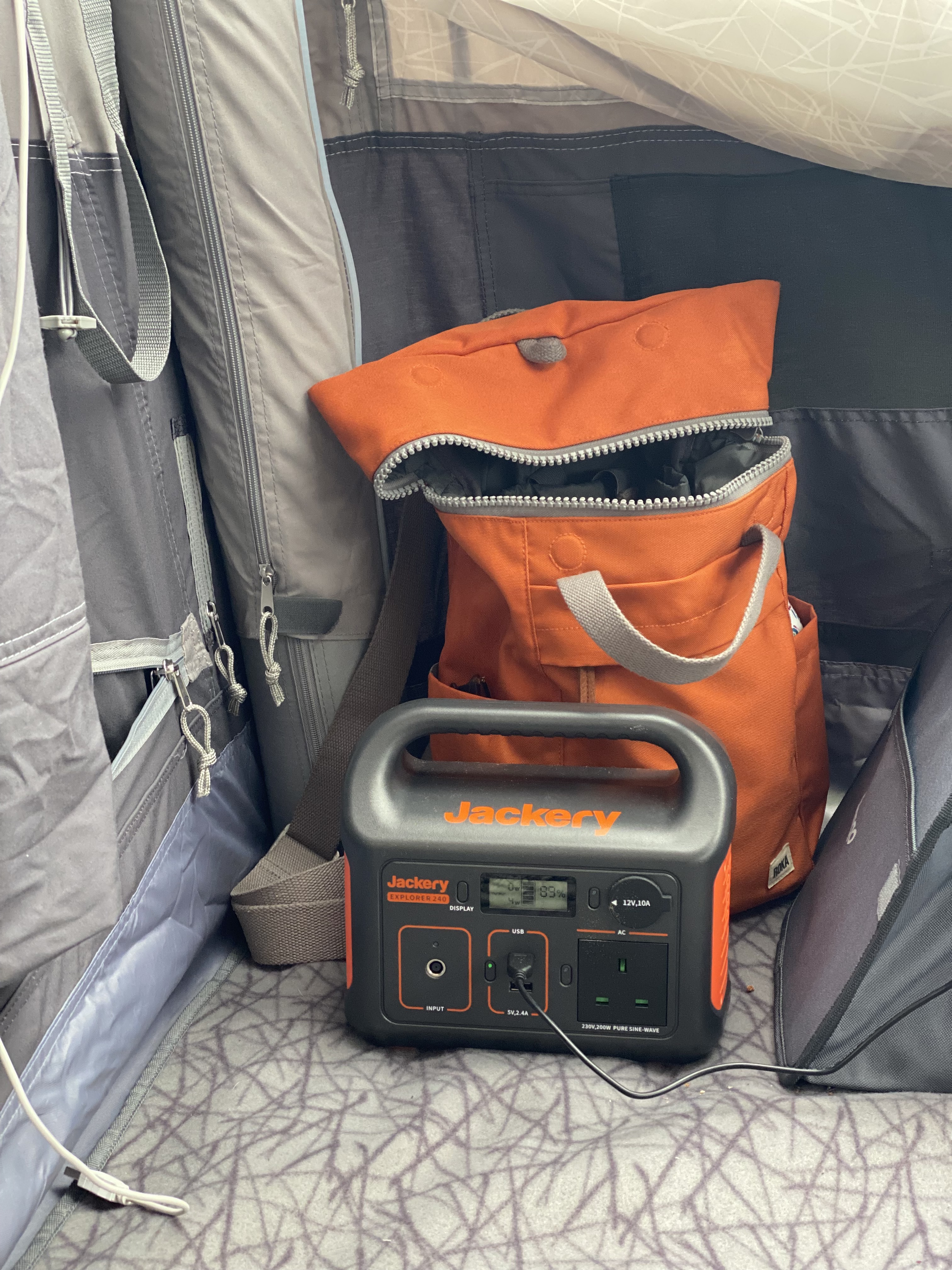 I don't have a solar panel on the van - so when I'm staying in off-grid locations (such as the Romney Marsh) I use a power block with a 240V plug socket. It runs my laptop etc. The fridge runs separately off my leisure battery which charges when I'm driving. Usually, the van is charged by an electric hook-up supplied by a campsite.