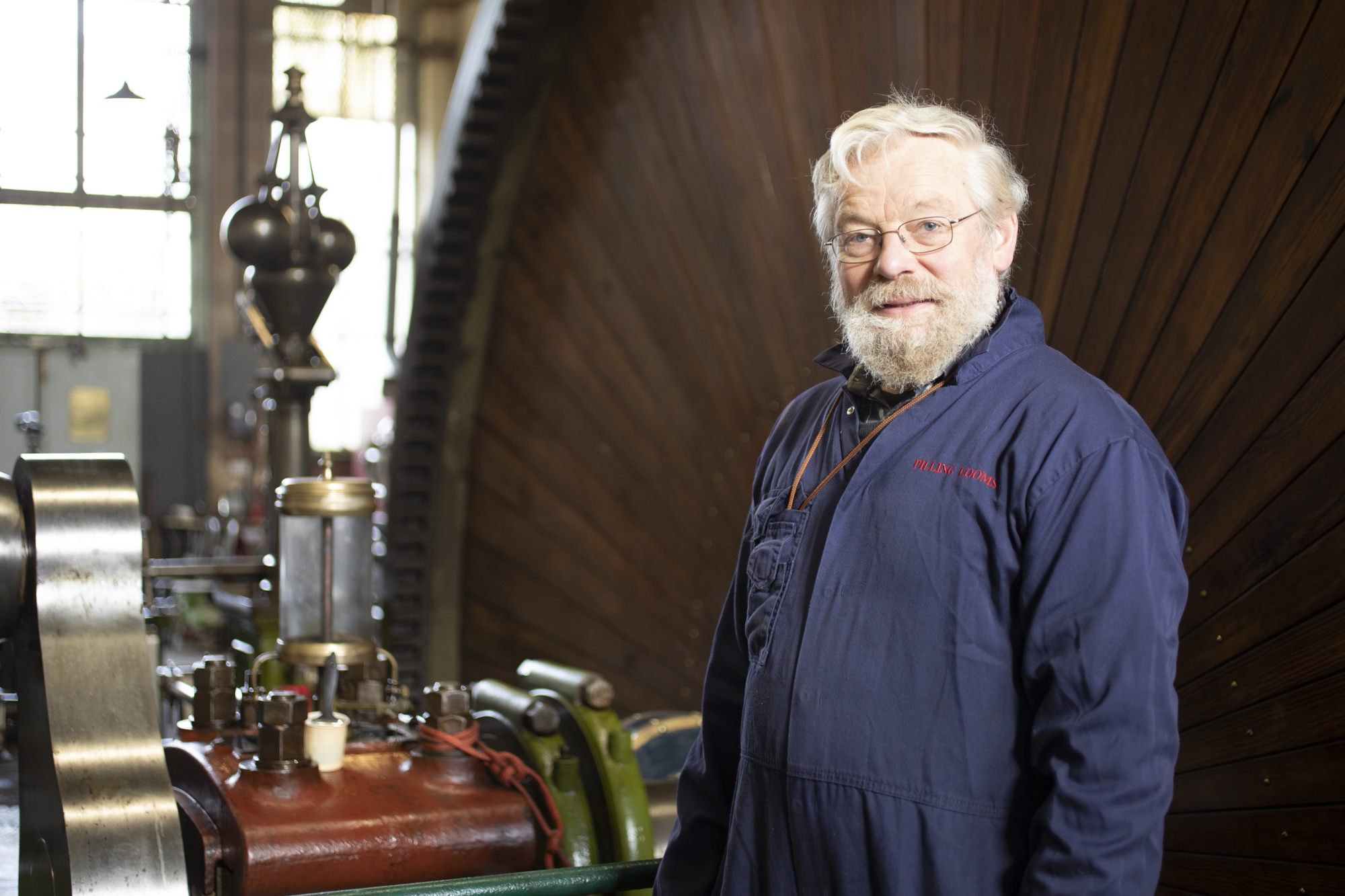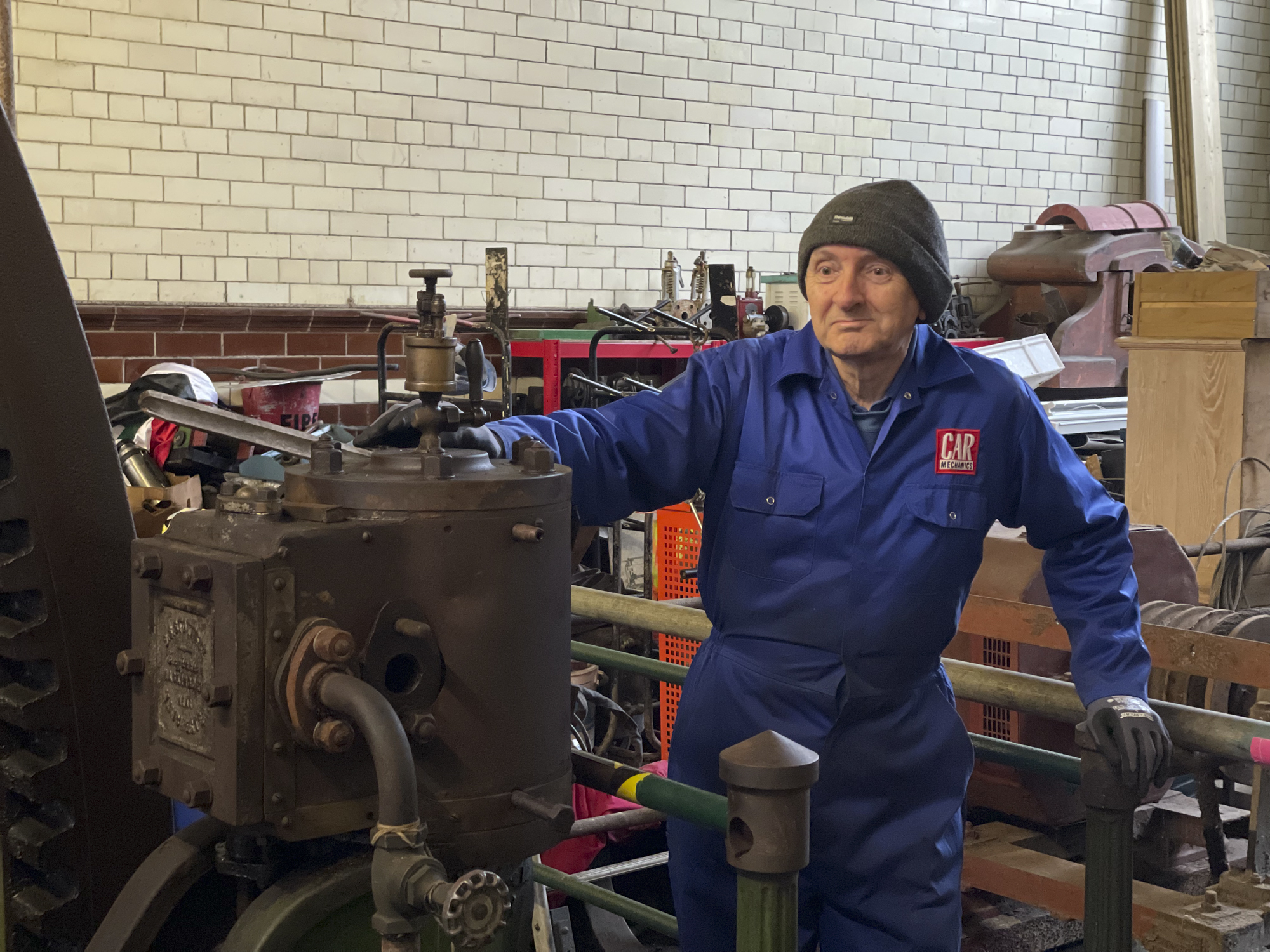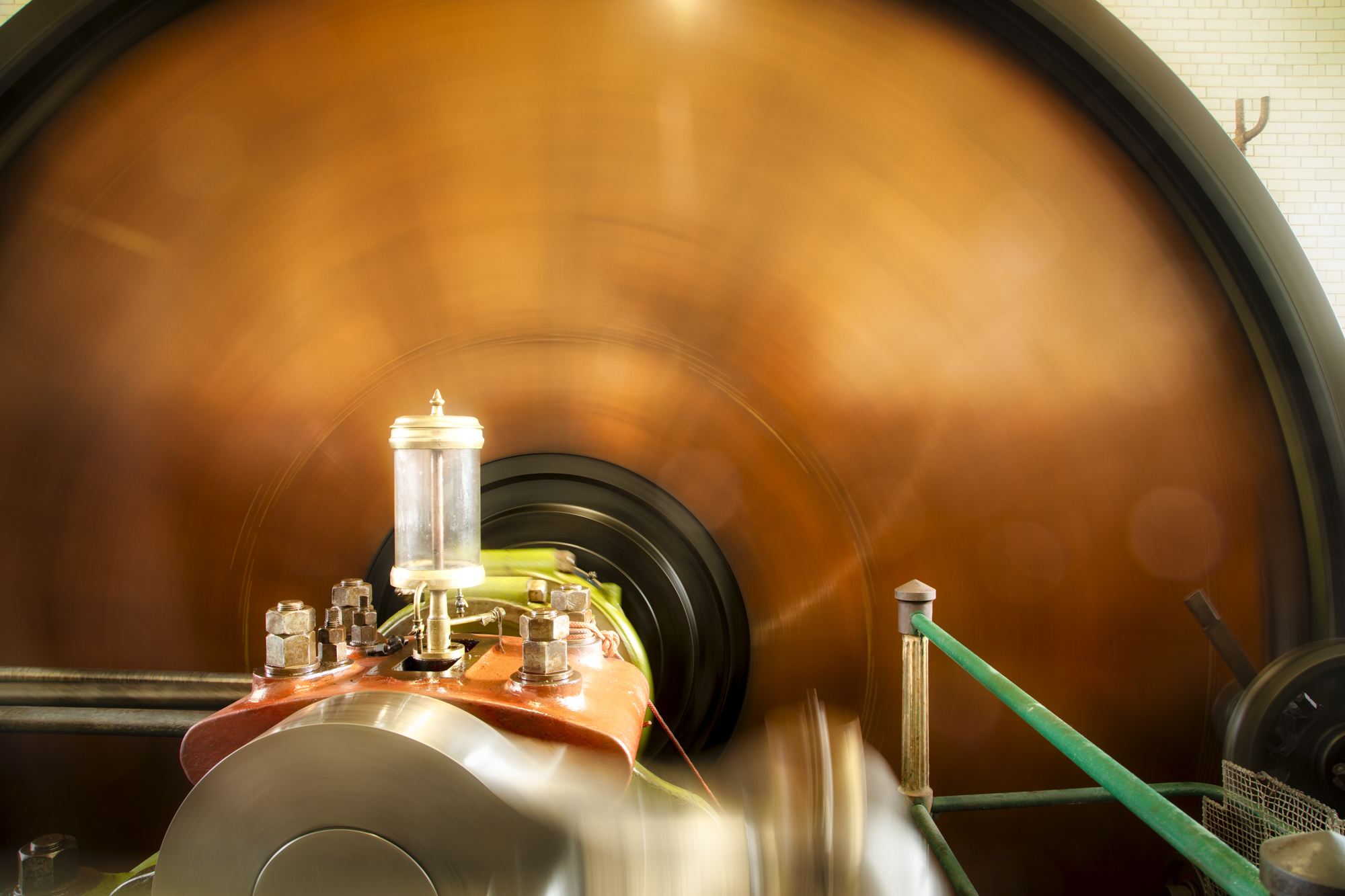 The flywheel in operation at the Grade II* listed Grane Mill. Part of the Stott engine that bears the name 'Alice'.