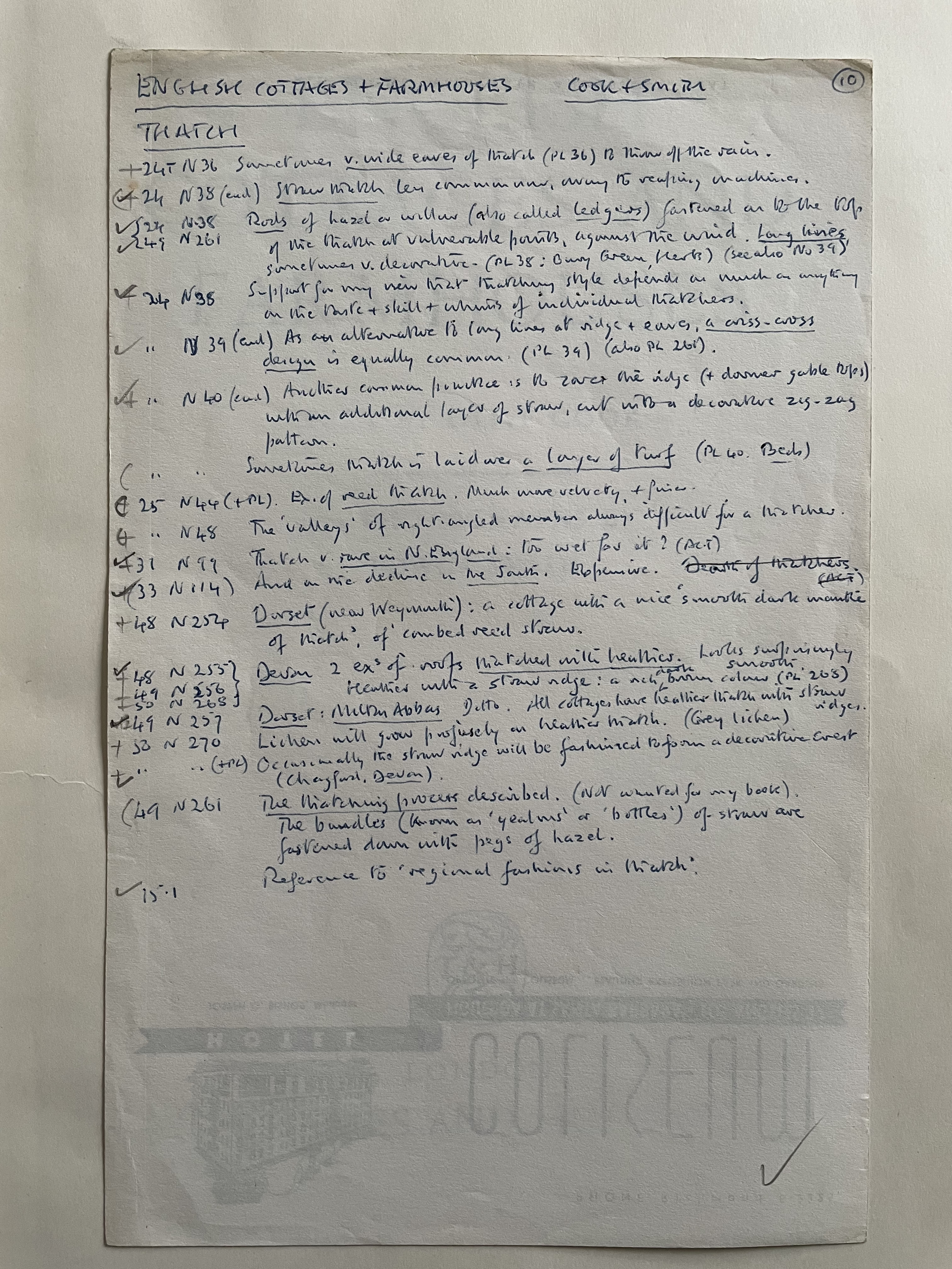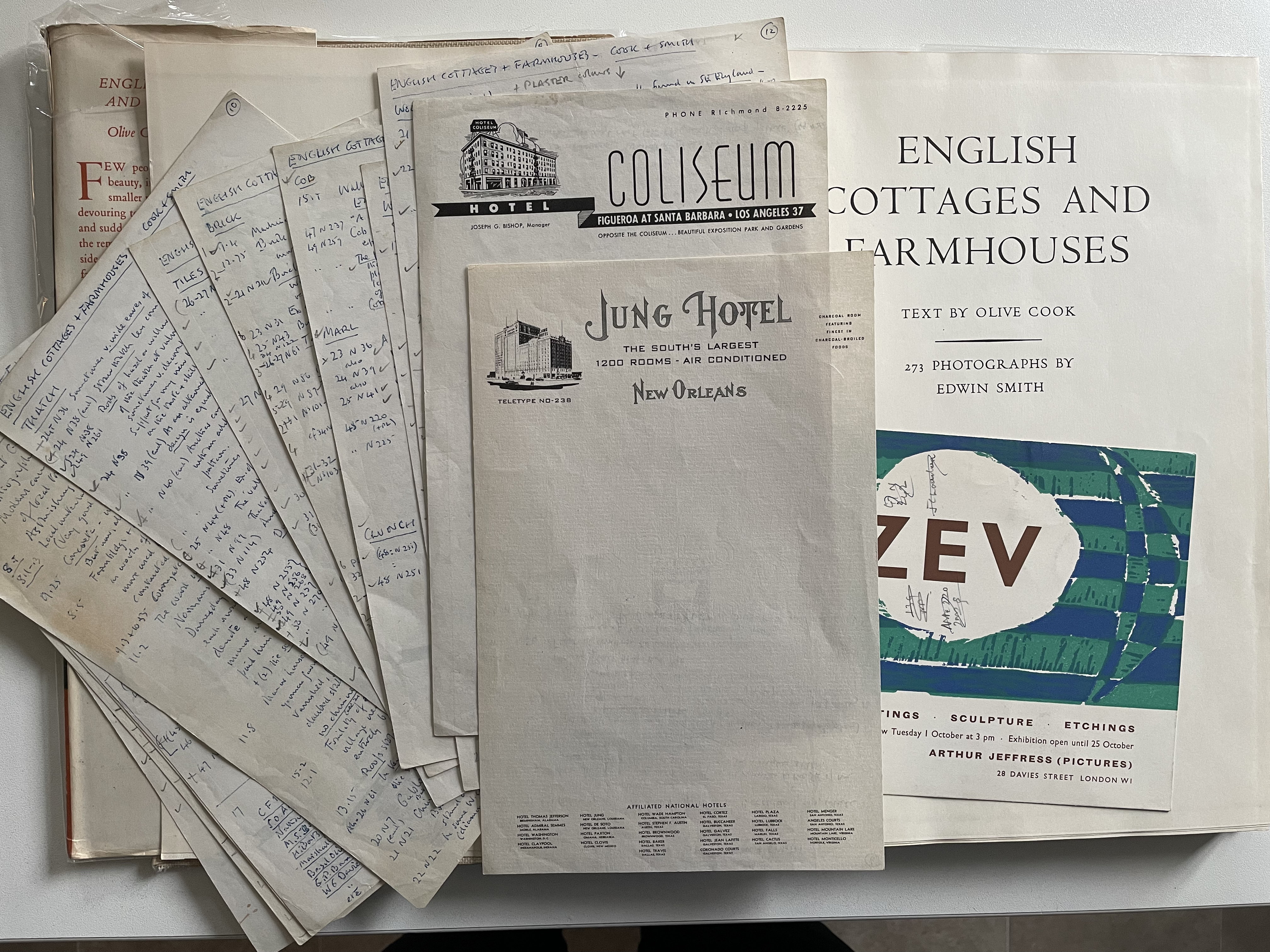 Hidden inside the book cover are a dozen loose pieces of complimentary writing paper taken from hotels in the USA. One is from the Coliseum in Los Angeles - with the strapline: “ALL ROOMS WITH BATH AND STEAM HEAT”. Another from the Jung Hotel, New Orleans advertises a “charcoal room featuring finest in charcoal-broiled foods”. Written on them in a small neat script and dated “DEC 1957” are some notes taken by a previous owner of my book. In the notes there is talk of stepped roofs and steep gables, oolitic stone and whitewashed granite cottages, chalk and clay, brick and flint. The writer is Alec Clifton-Taylor (whilst lecturing in the United States) taking notes for his as yet unpublished book The Pattern of English Building. Here inside this mid-century book was another chromosome in the creative DNA of everything that was dear to me. The photographer, the photographs, the buildings and the writer.