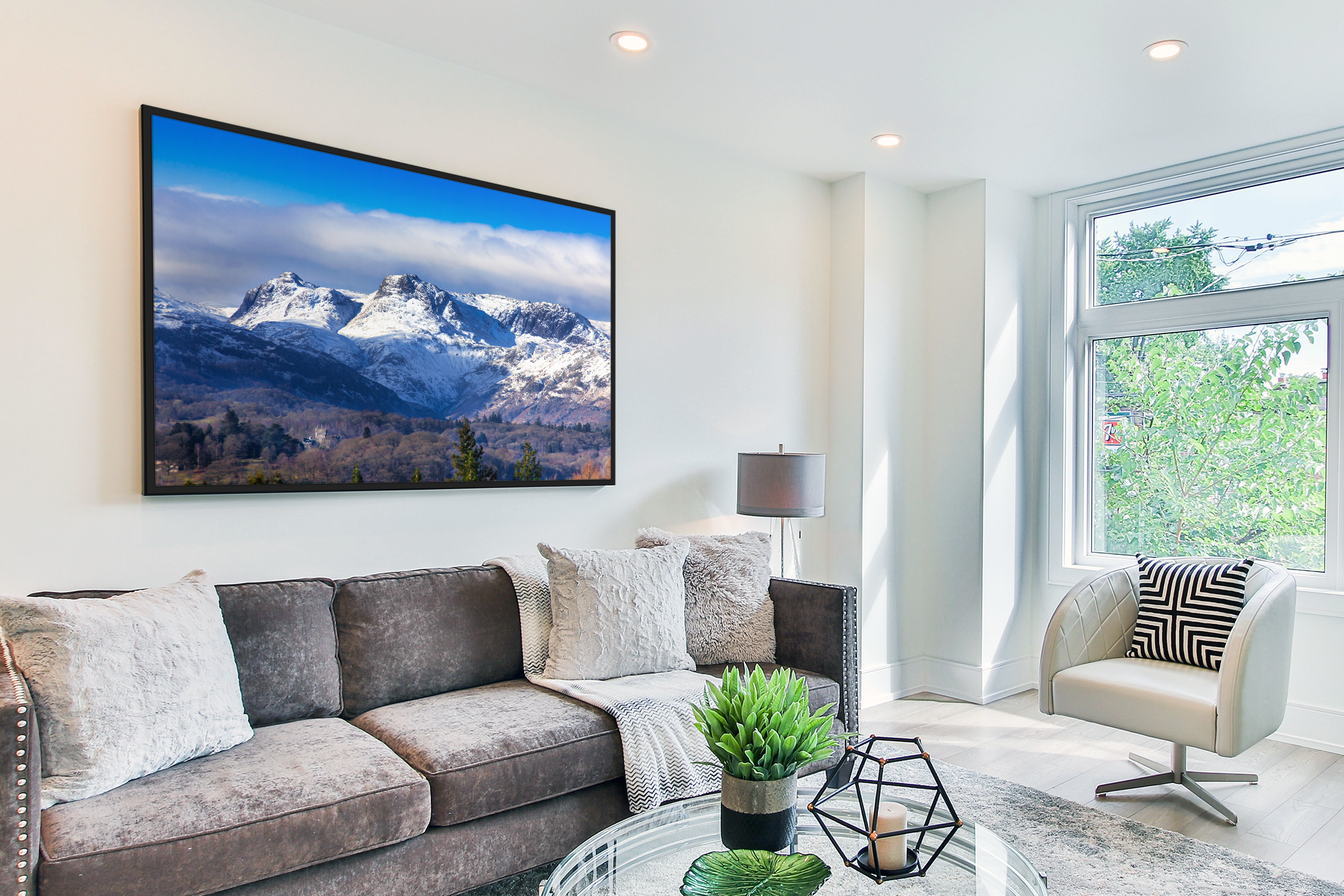 Download this digital print at the click of a button. This is one of my favourite photos taken in the Lake District. Wray Castle is swamped by the majesty of nature shouldered by the snow capped Langdale Pikes. [more...]