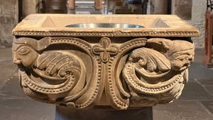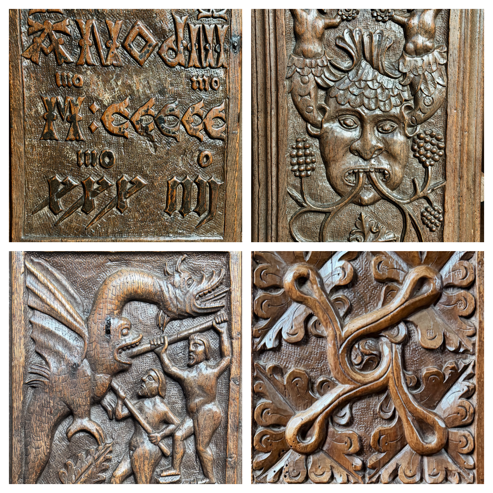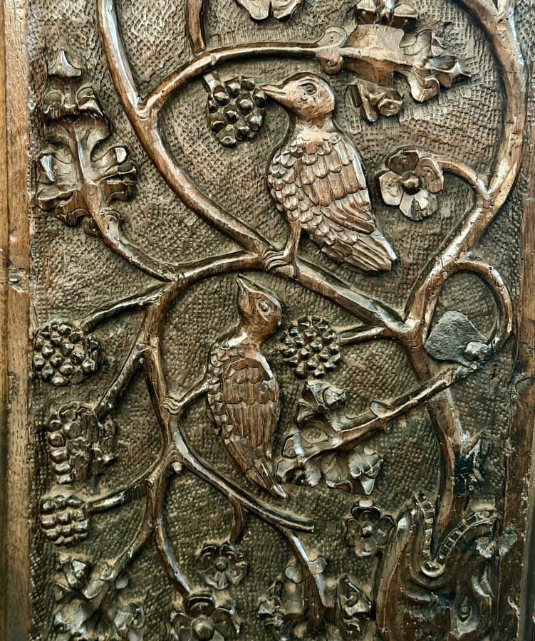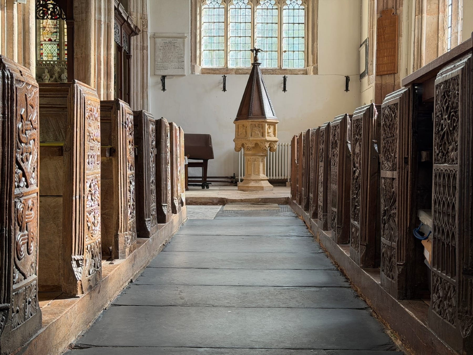 If it had snowed all the way down from Scotland, I would still have found spring inside this church - for the bench ends are alive with the most delicious foliate carving - green men, mythical creatures, birds and other animals.