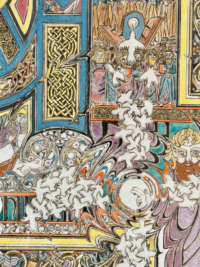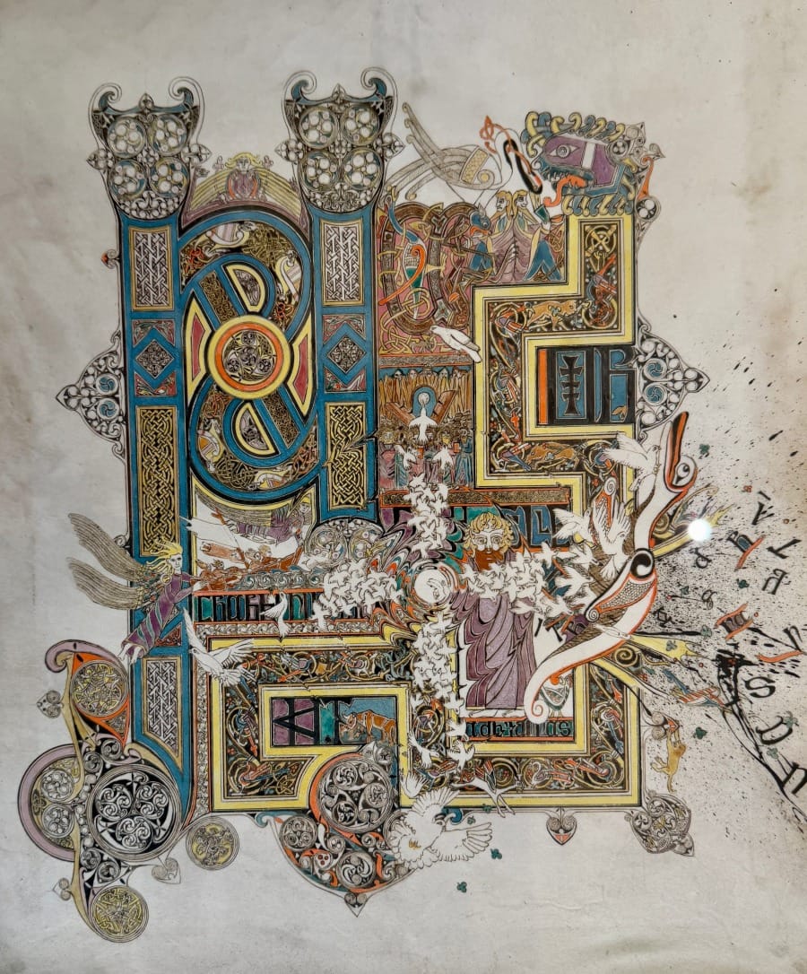 In the centre, a contemporary artist has created illuminated scripts in the Insular style. To stand before one is to realise that an illuminated manuscript is not simply decoration around text. It is a singular world compressed into a page.