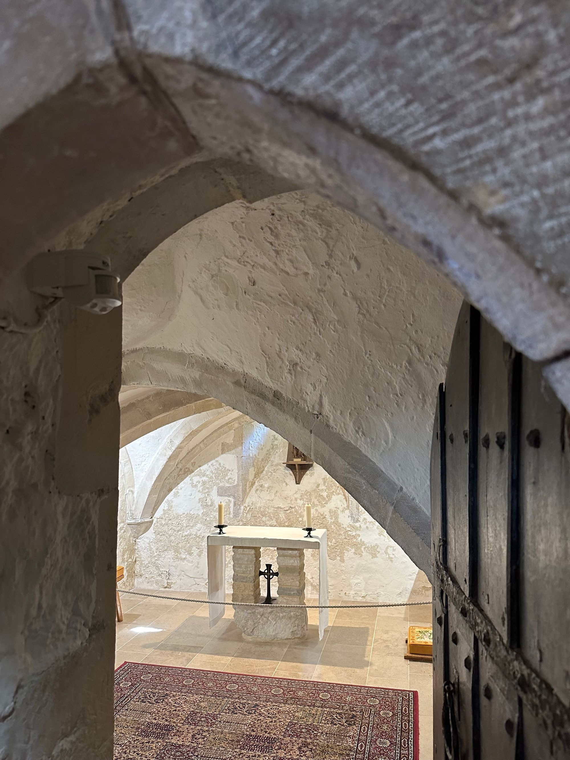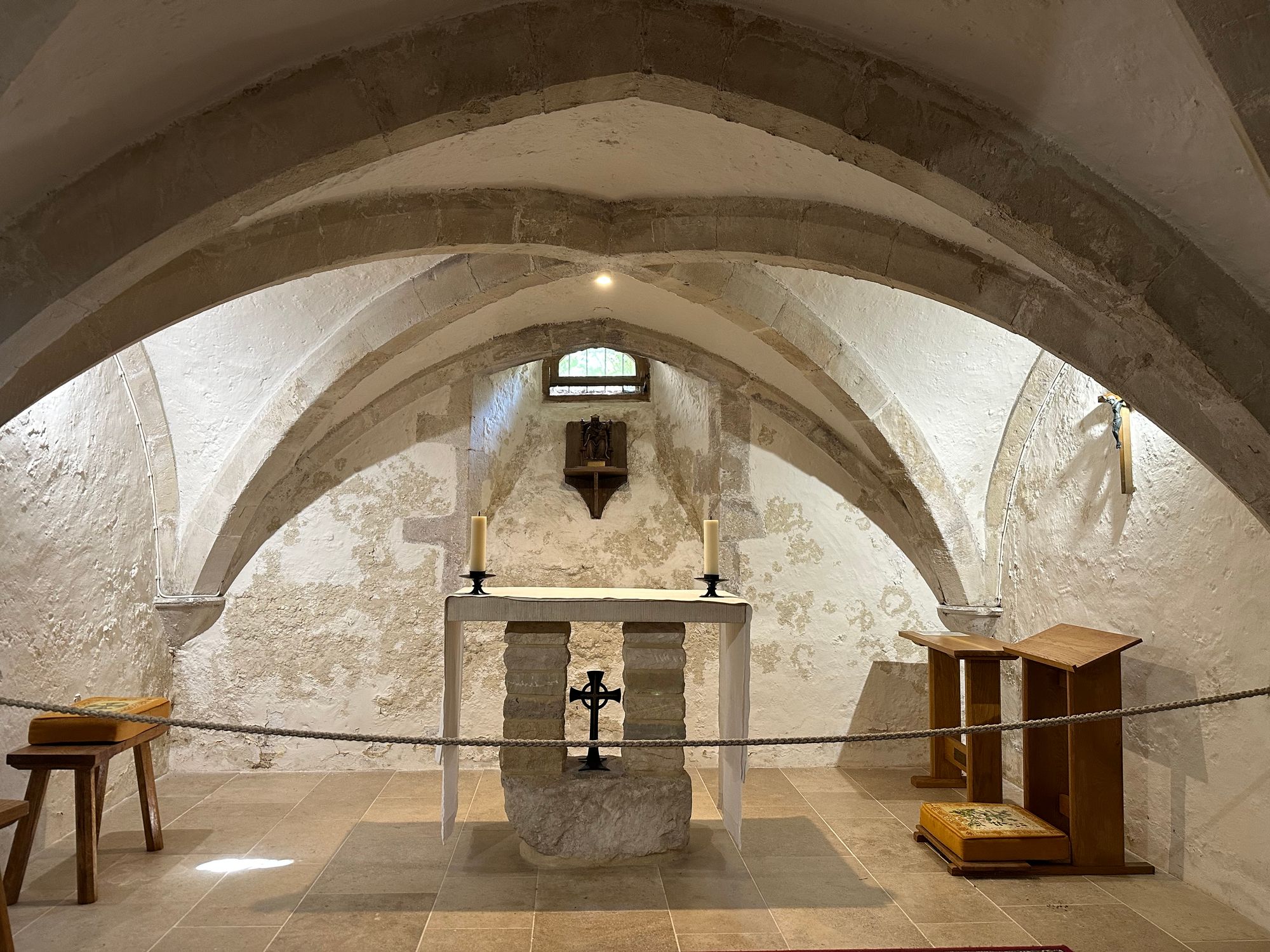 The C14th crypt has rib vaults made of Caen stone. Now a chapel it may have originally been a charnel house.