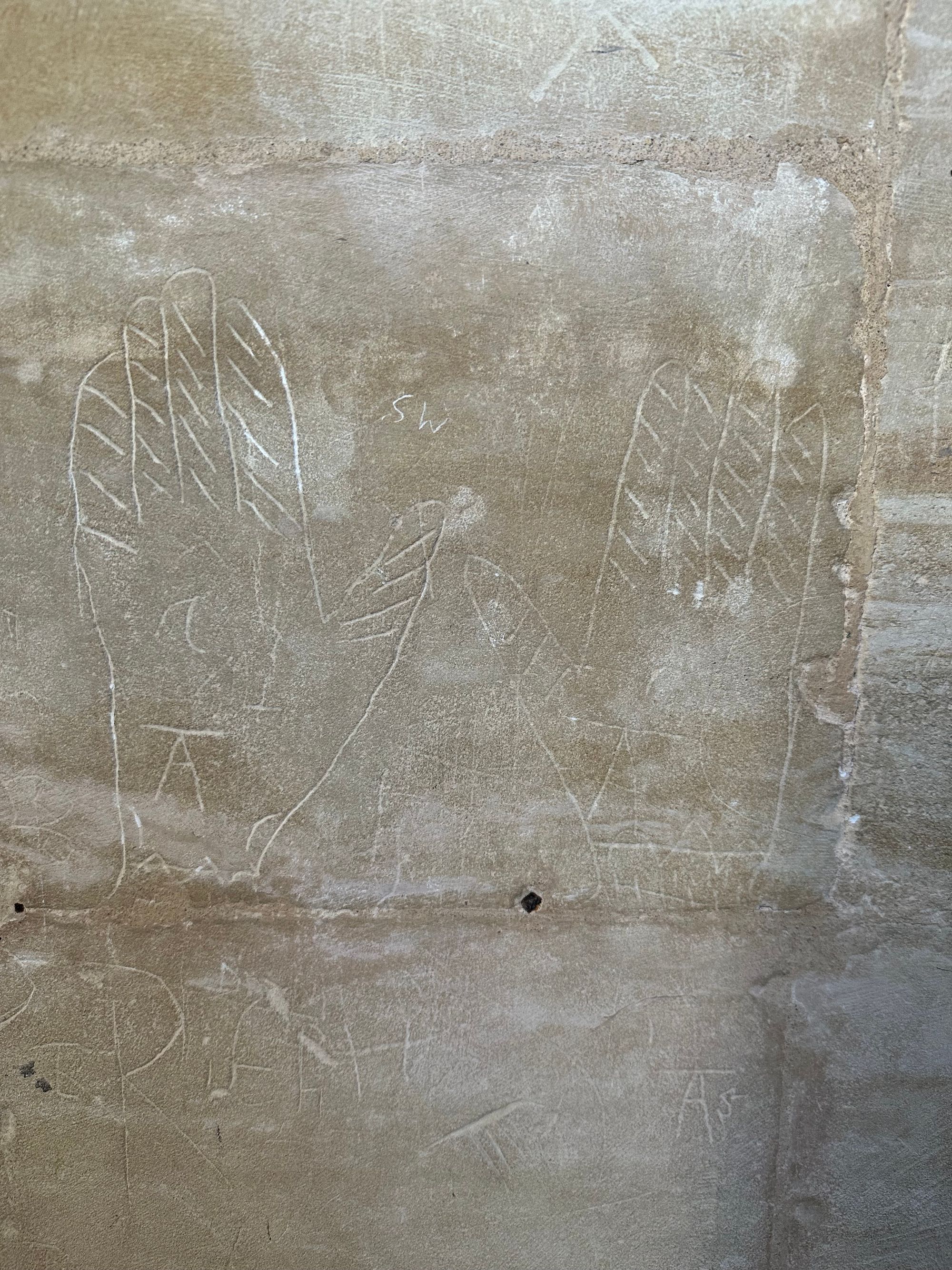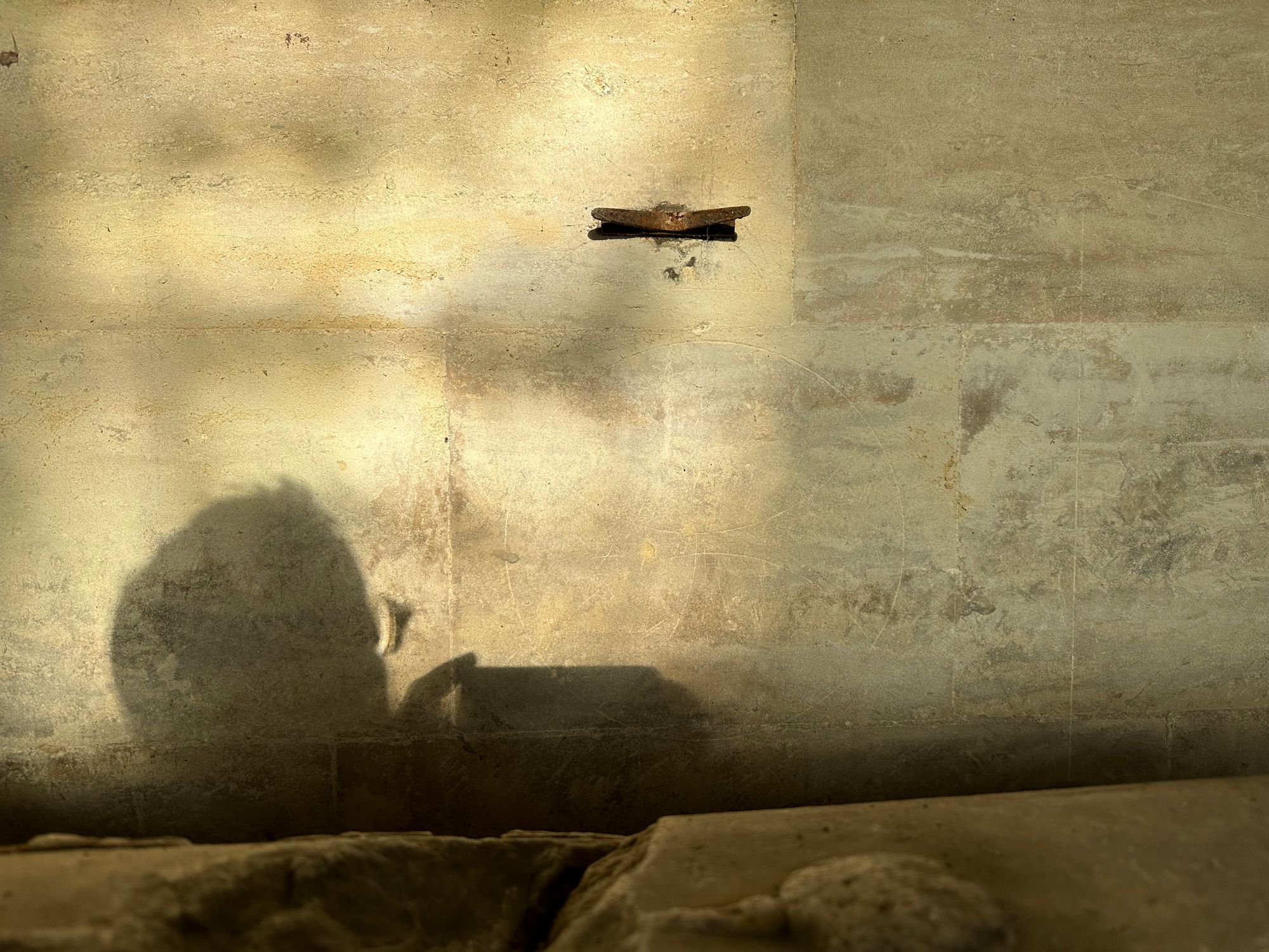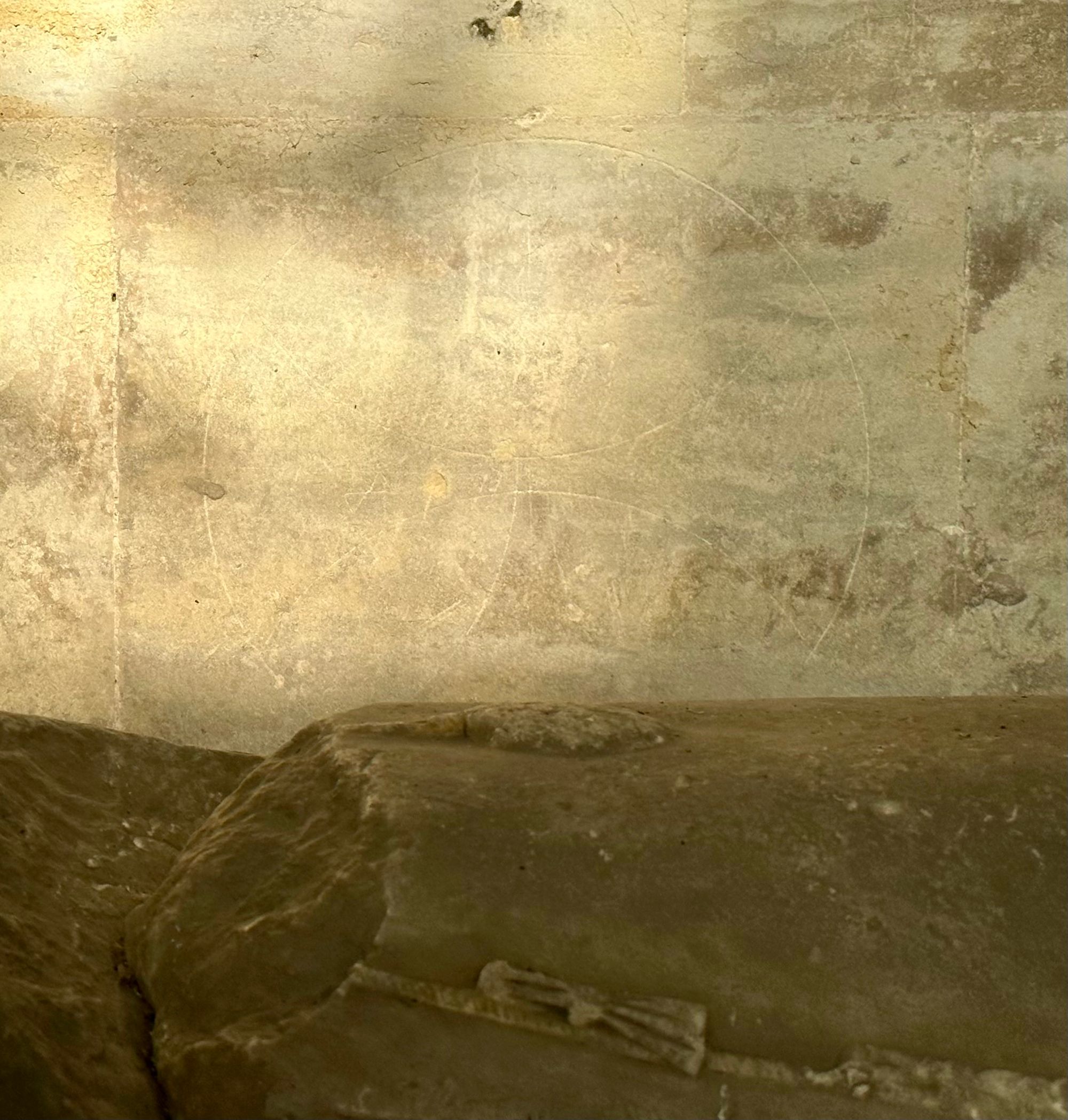 I think I see a mark on the wall behind the effigy, but then itβs shrouded in shade, until the tree shadows move away, and there it is again.