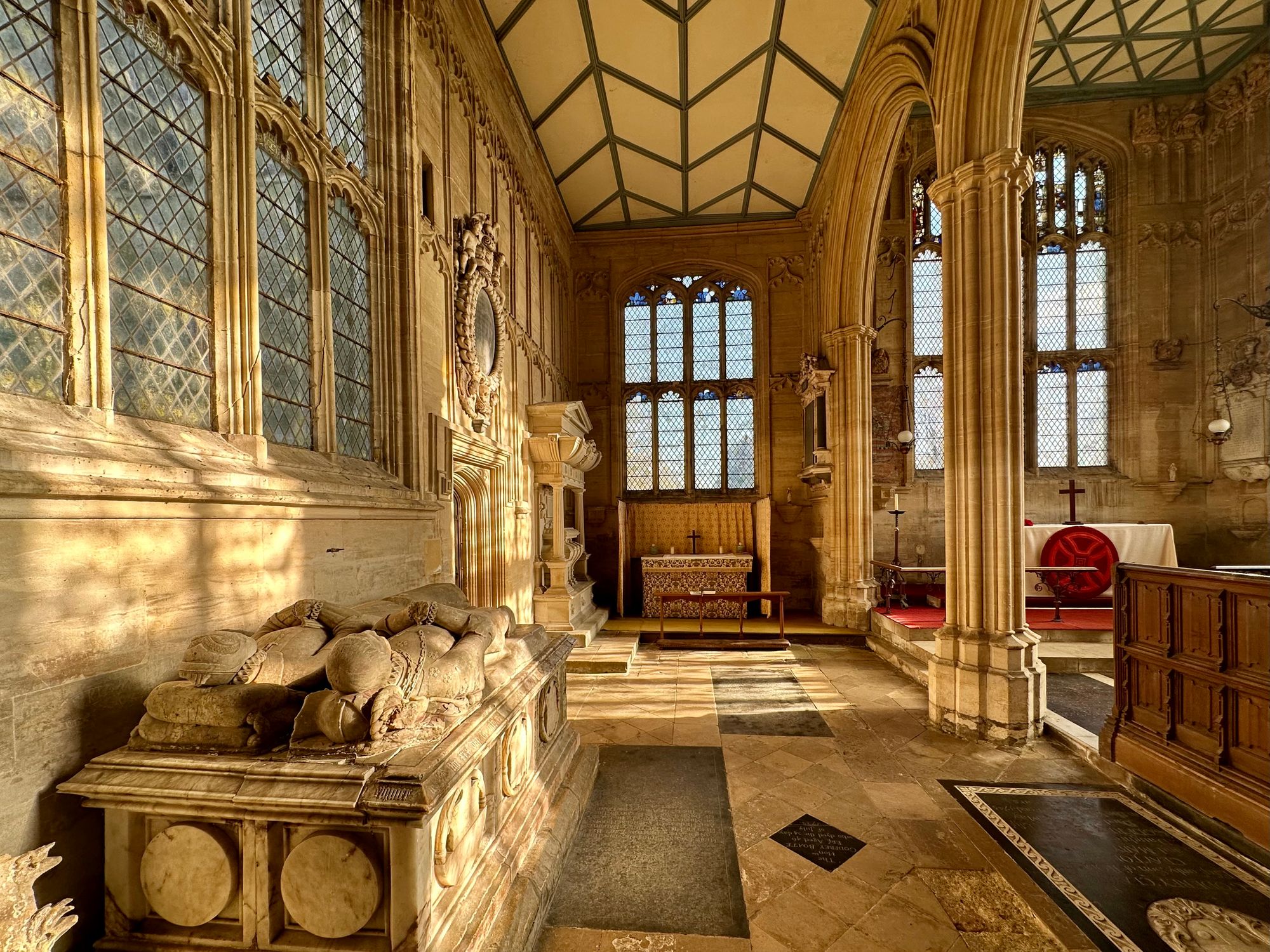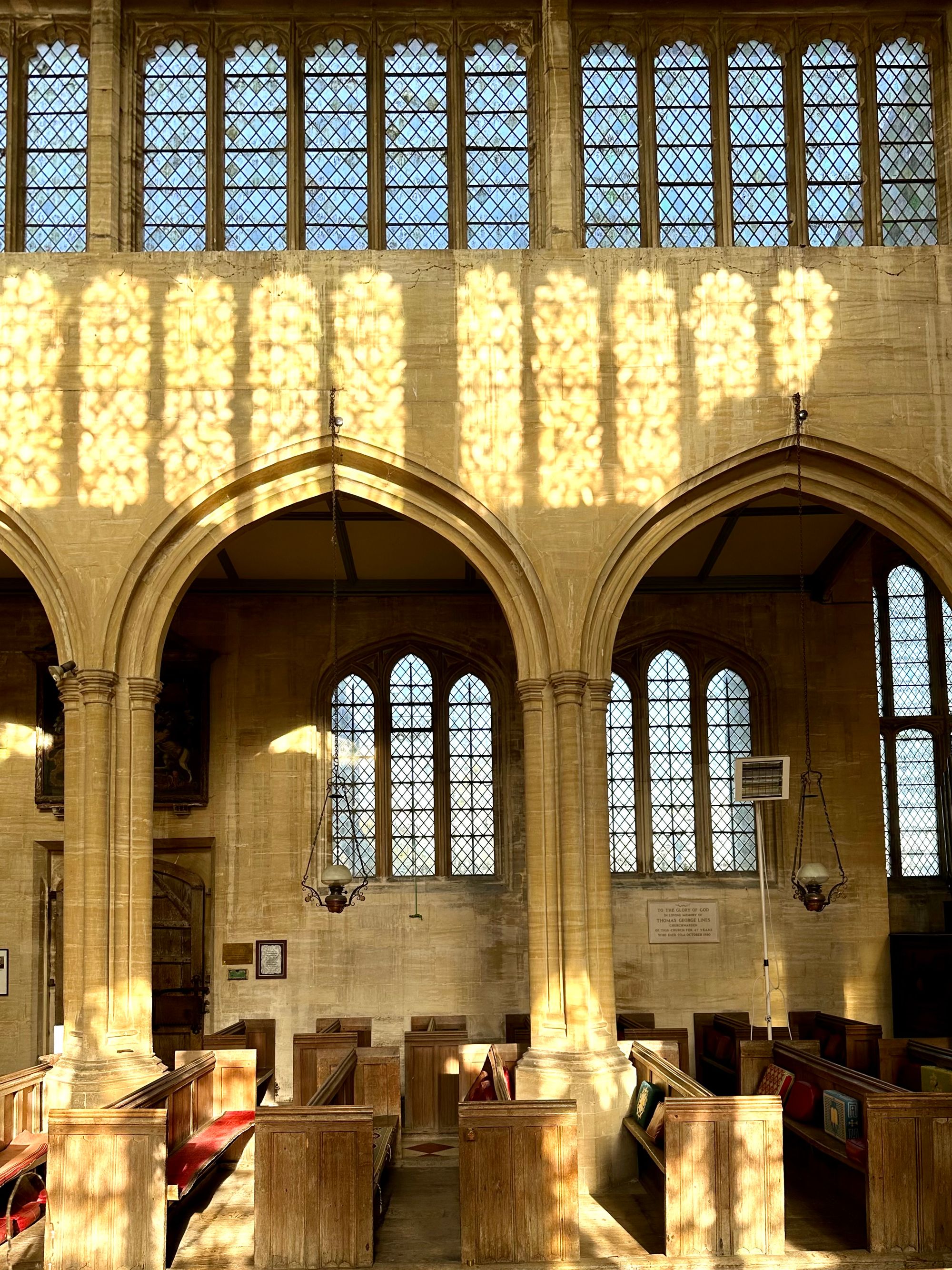 Inside, the light is prismatic, percolated by the imperfections in the glass quarries and softened by a hazy bank of cloud to the south. Itβs like being inside the eye of an insect. Trees that are moving in the breeze are motioning shadows on the north chapel wall.