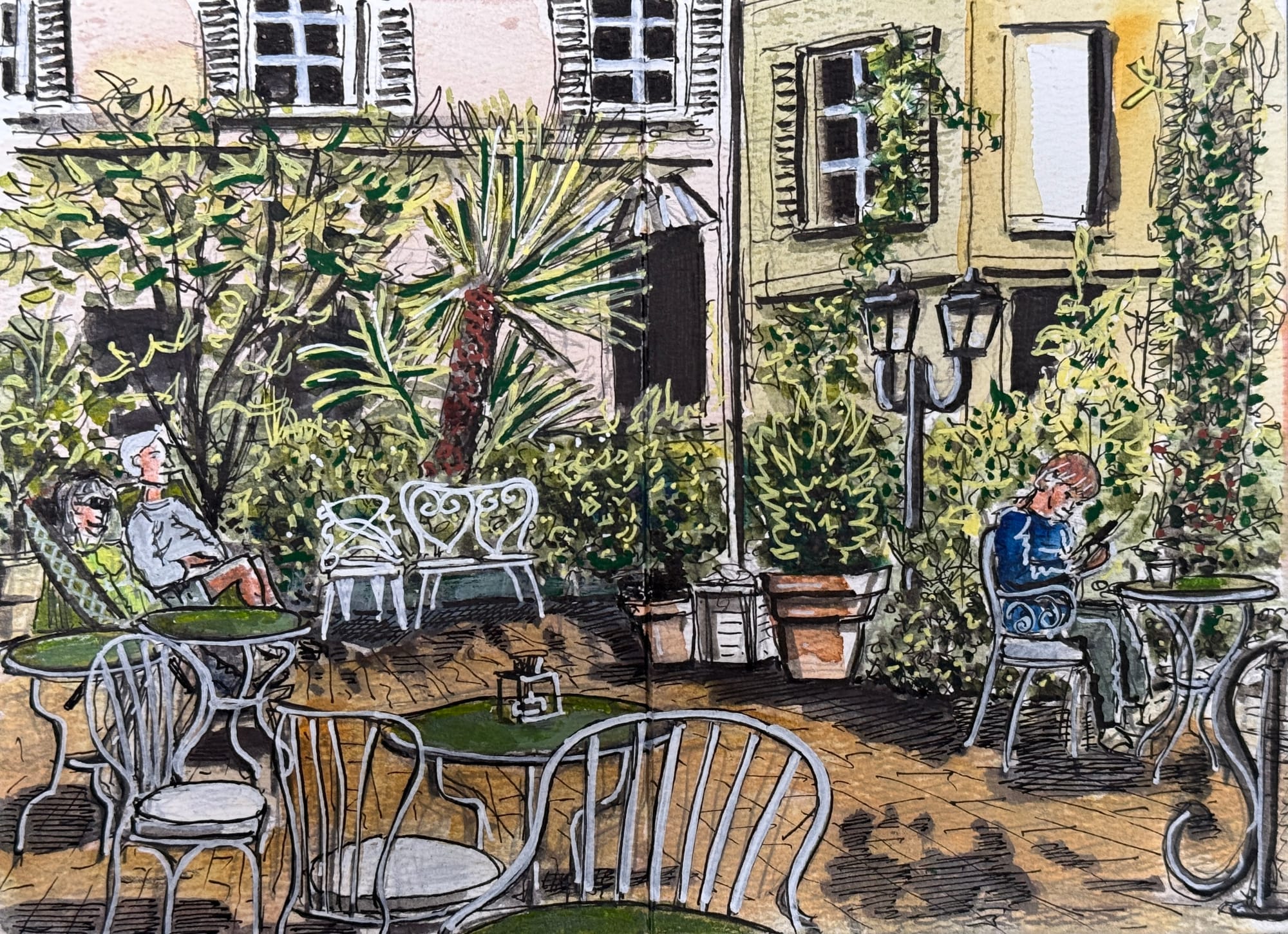 I've stayed at the Hotel Des Grandes Ecoles many times. I can't recommend it highly enough. It isn't cheap and I was lucky that this trip came as a birthday present. It was whilst I was sat here sketching that I met artist Marta Fonfara who pointed out one of her sketches in an art publication that I had on the table. Her Atelier is in the courtyard of the hotel.