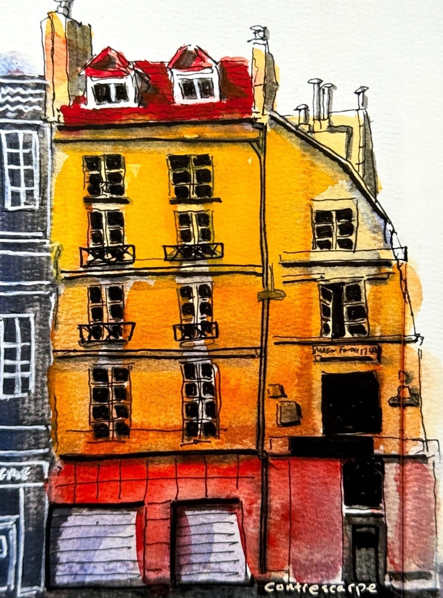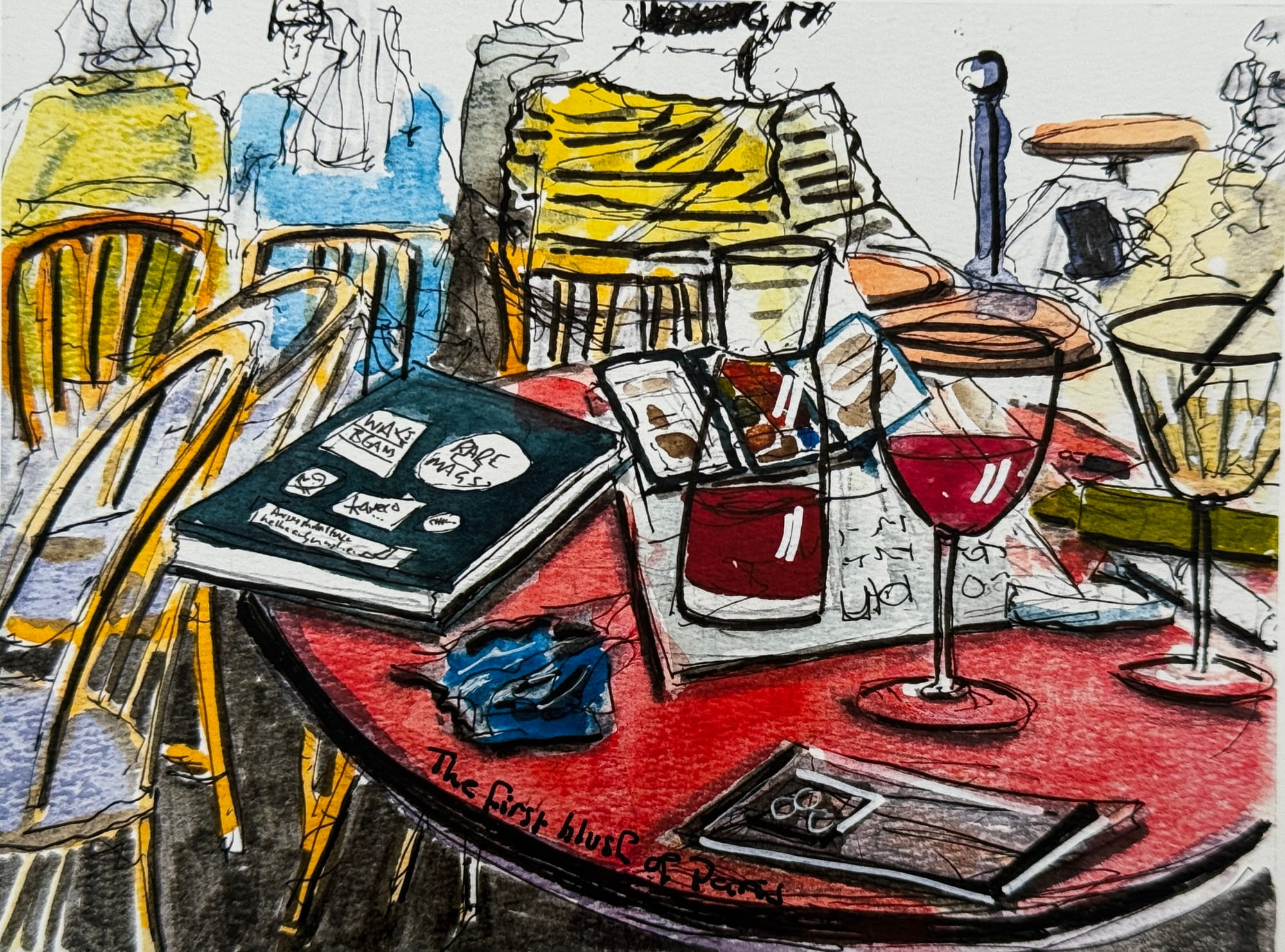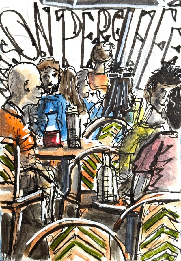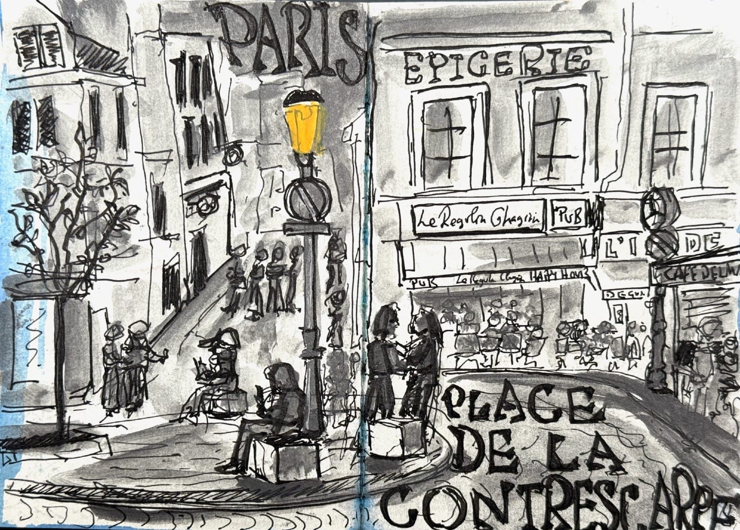 There's nothing that beats the first blush of Paris - the early days when you're taking it all in. The views and vistas, the people watching, the wine and food. Another sketch here from the Place de la Contrescarpe where all the chairs face outwards into the square.