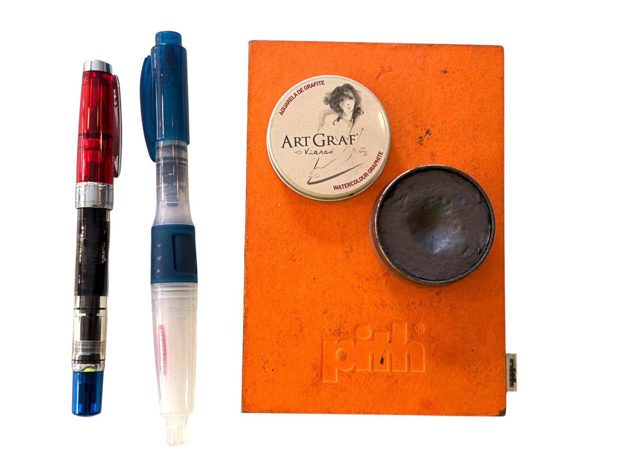 How could I forget it! I left out my beloved tin of Art Graf soluble graphite. I use this in my minimal sketch set up. My pith pocket book, my TWSBI fountain pen and a water brush (which holds water inside).