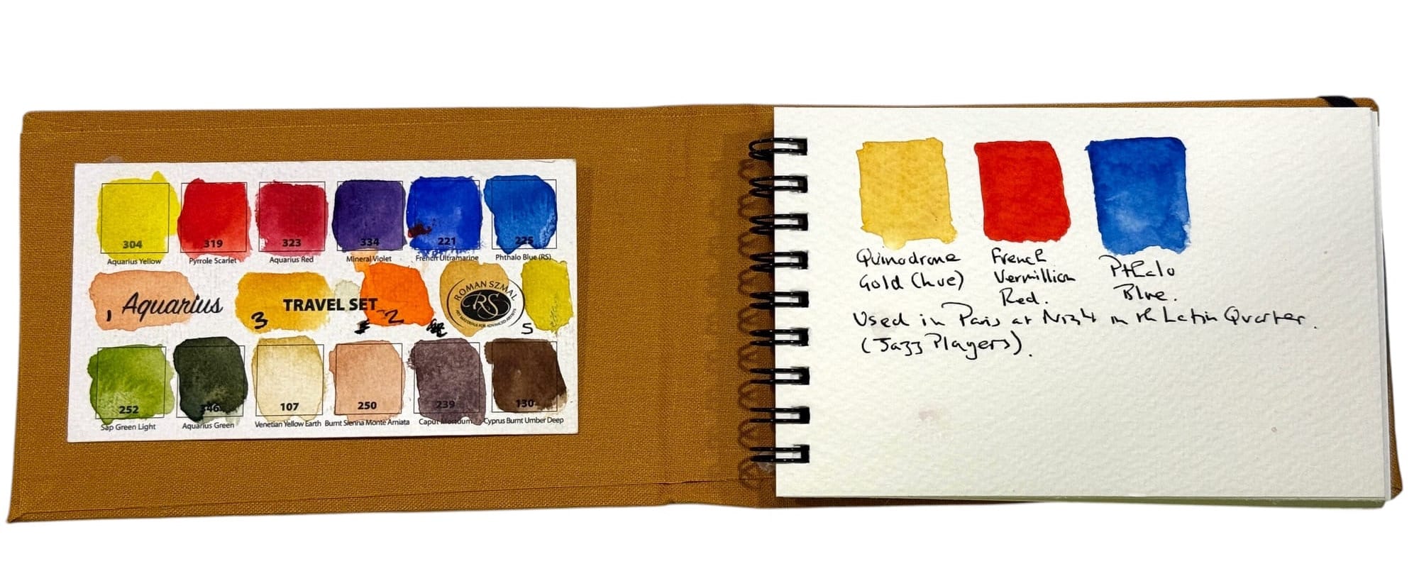 I bought this to use as a record for my swatches - where I record where the colour combinations turned out best and in what sketches. The swatch on the right below was used in my Paris Jazz players sketch.