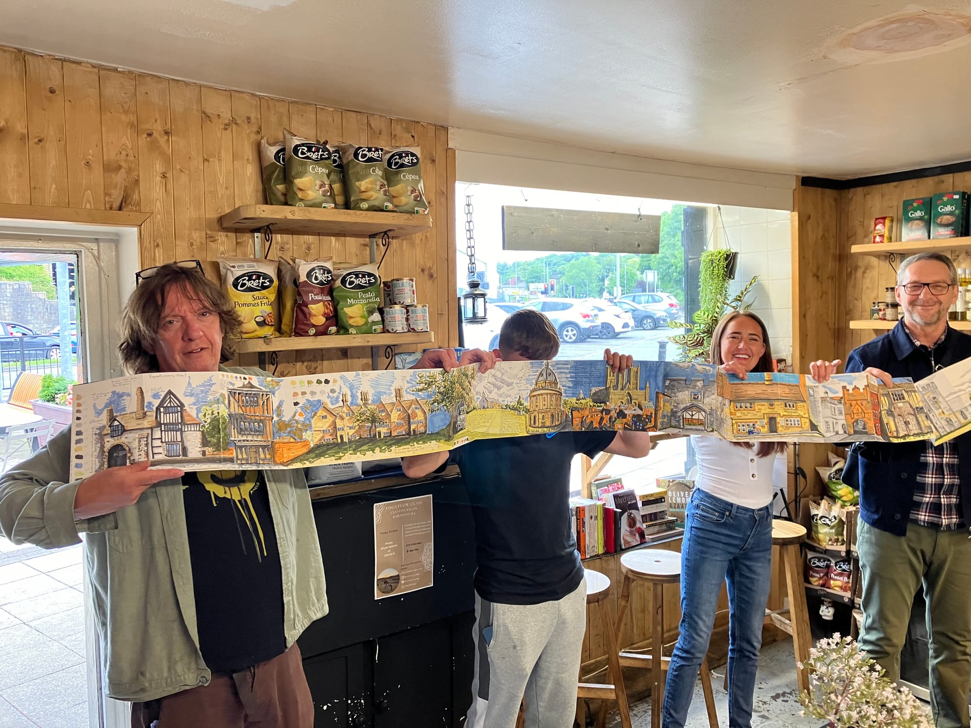 This art work is a print taken from a concertina sketchbook that I am working on that records some of my favourite buildings from my travels. It places them next to each other in the perfect street.