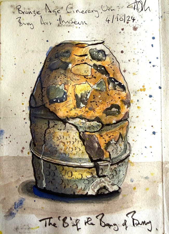 In Bury, we began outside the magnificent St Mary’s Parish Church. There, kerbside, we traced the spot where two navvies uncovered a Bronze Age cinerary urn in the early 20th century.